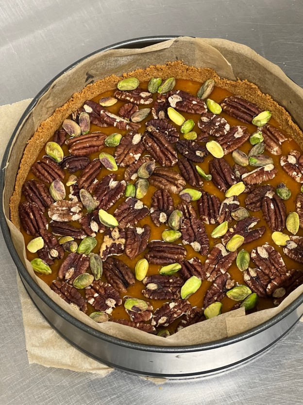 Häll smeten i formen. Skär 15 st After eight i småbitar och tryck ner i formen.