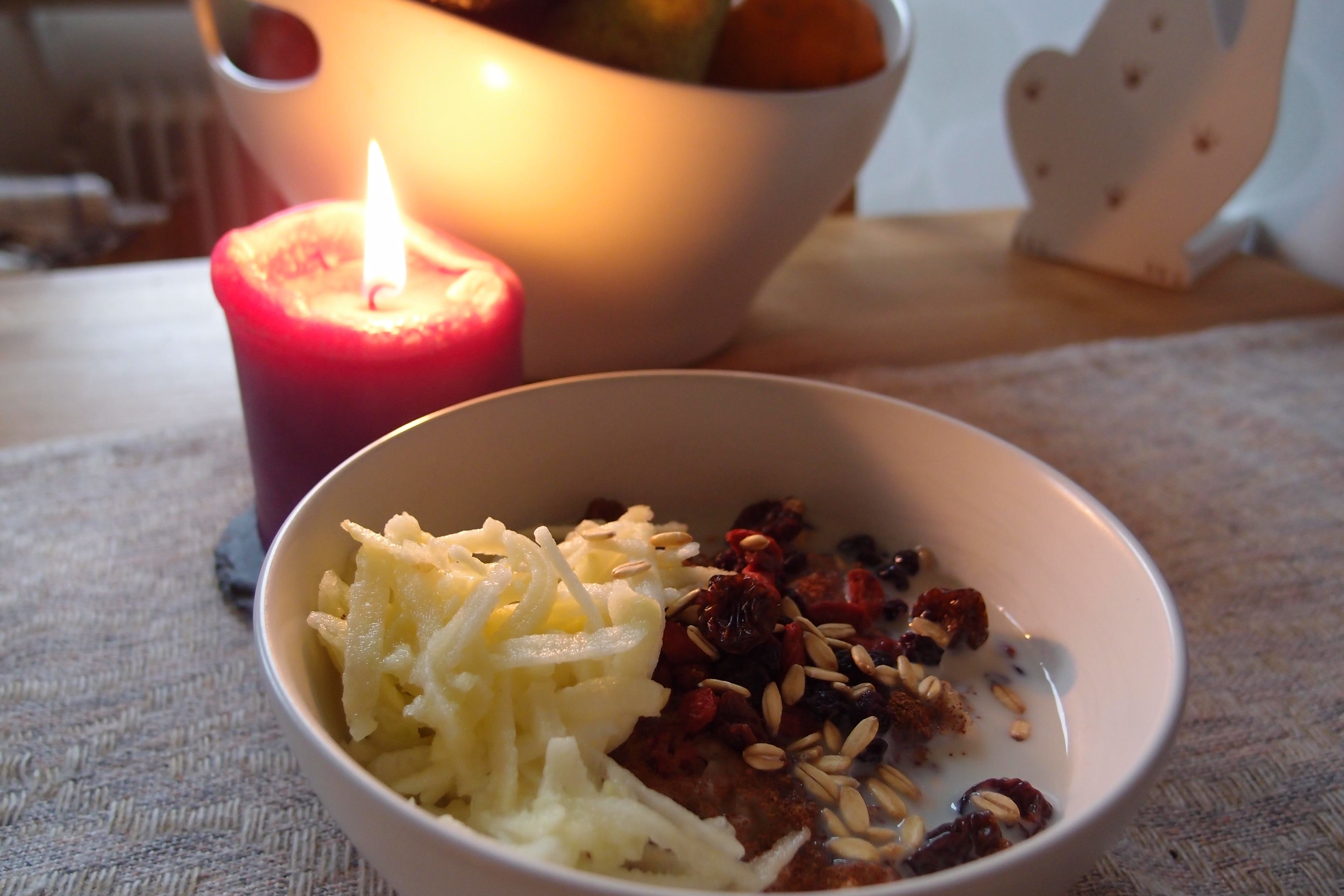 Havregrynsgröt med sylt och mjölk känns lite tråkigt och sliskigt tycker jag. Så imorse pimpade jag min gröt med andra godsaker som psylliumfrön (även kallat loppfrön-bra för magen), havrekärnor (för att förstärka havresmaken och få lite tuggmotstånd), torkade frukter och bär, kardemumma, kanel och rivet äpple. Till det sojadryck. Gott värre!