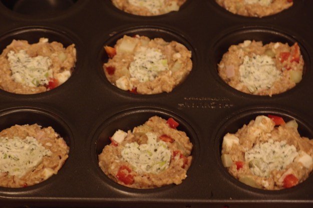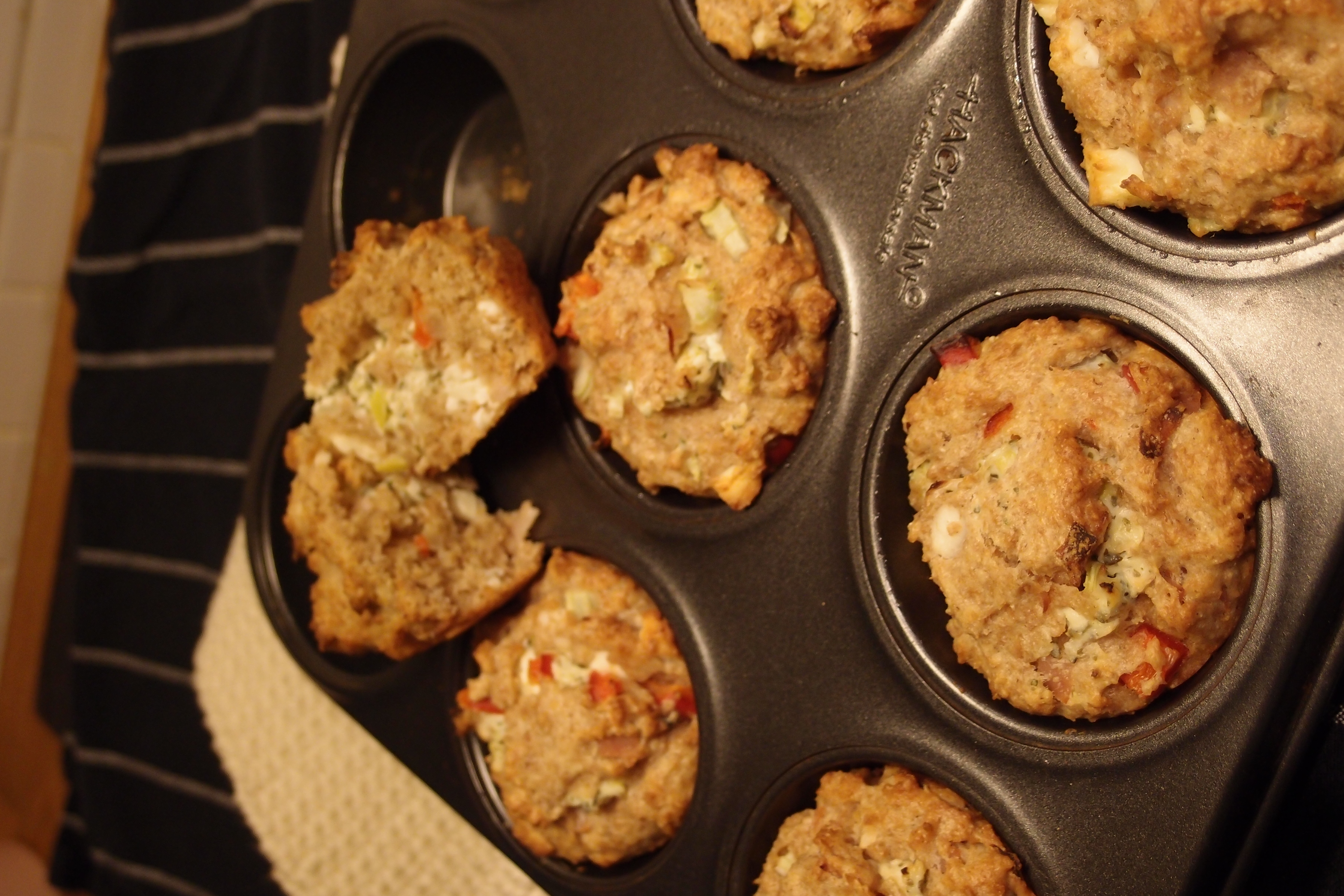 Jag ville göra mina matiga muffins någorlunda nyttiga så dinkelmjöl fullkorn fick bli basen. I övrigt tog jag ingredienser vi hade hemma till fyllningen (rökt kalkon, paprika, feta ost, färskost, purjolök och basilika).