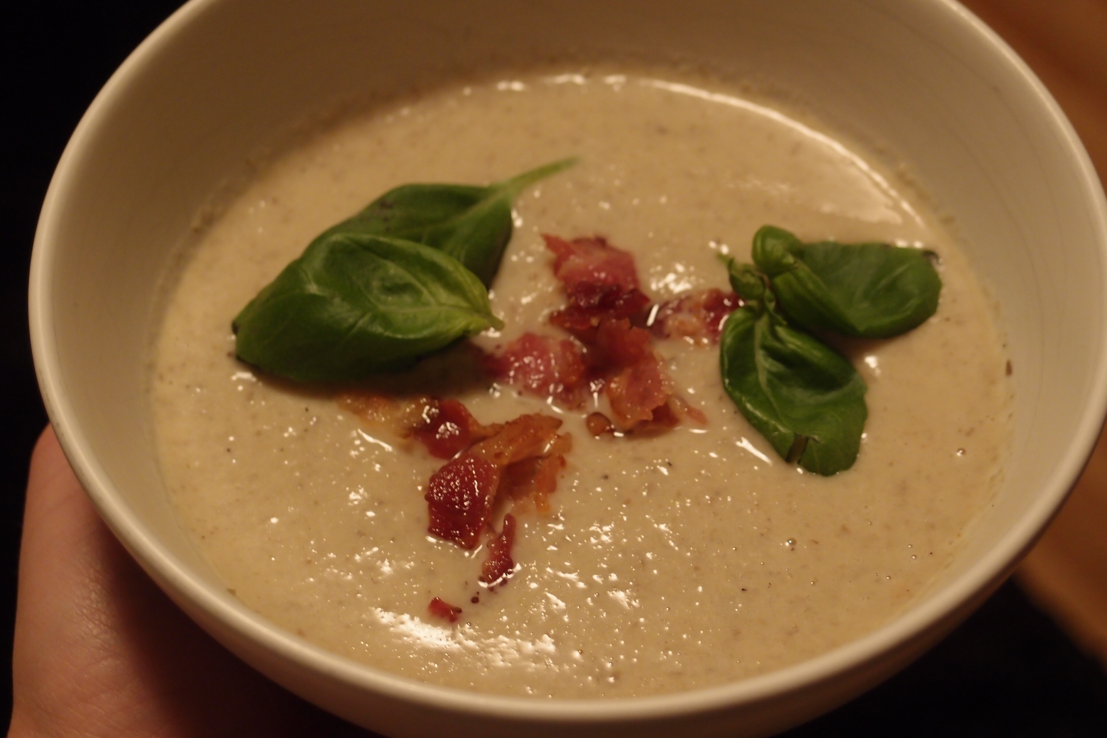 Nu gjorde jag ju inte bara matmuffins, det blev också en höst- och vinterfavorit; champinjonsoppa toppad med knaperstekt bacon och basilika.