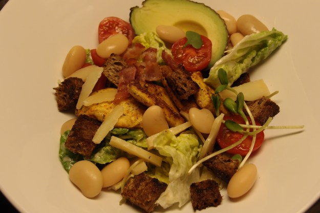 Romasallad vänt i Caesardressing, currystekt kycklingfilé, solrosskott, tomat, avokado, vita stora bönor, grova brödkrutonger, knaperstekt bacon och parmesan. Några skivor surt äpple är pricken över i!