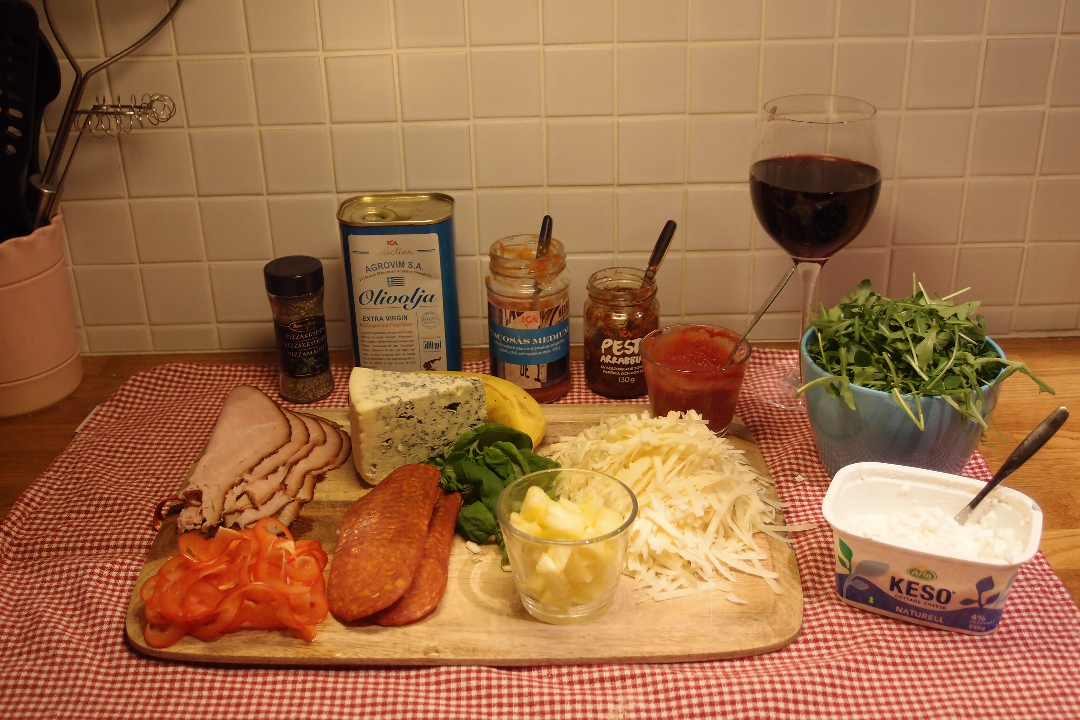 Jag dukade upp lite olika toppings. Idag körde vi latmansmetoden; tomatsåsen bestod av ihoprörd ketchup, tomatpuré, salt och peppar. Jag tycker det funkar! Jag köpte välrökt skinka på lösvikt i butiken för den är såååå mycket godare än färdigförpackad. Man behöver inte tärna den, på med hela skivor bara! 🙂