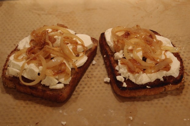 Jag smörstekte rågtoast på båda sidorna och fördelade en god getost över bröden. Jag smörstekte även lökringar och pressad vitlök mjuka, tillsatte lite socker så att det hela karamelliserades.. Det måste ni bara prova! Gudomligt gott! Såhär såg bröden ut innan de åkte in i ugnen på grill ca 5 minuter på hög värme. Jag toppade med gyllene pinjenötter och lite honung innan servering.