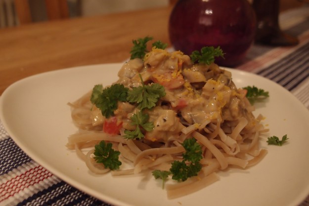 Smörstek lök och hackad svamp (jag adderade även paprika den här gången) tills de är mjuka och vätskan kokat bort. Tillsätt gräddmjölk, svampbuljongtärning, lite sojasås och peppar. Låt koka ihop till en krämig sås och avsluta med rivet citronskal (eller låt en remsa citronskal koka med i såsen. Den plockar man sedan bort innan servering).