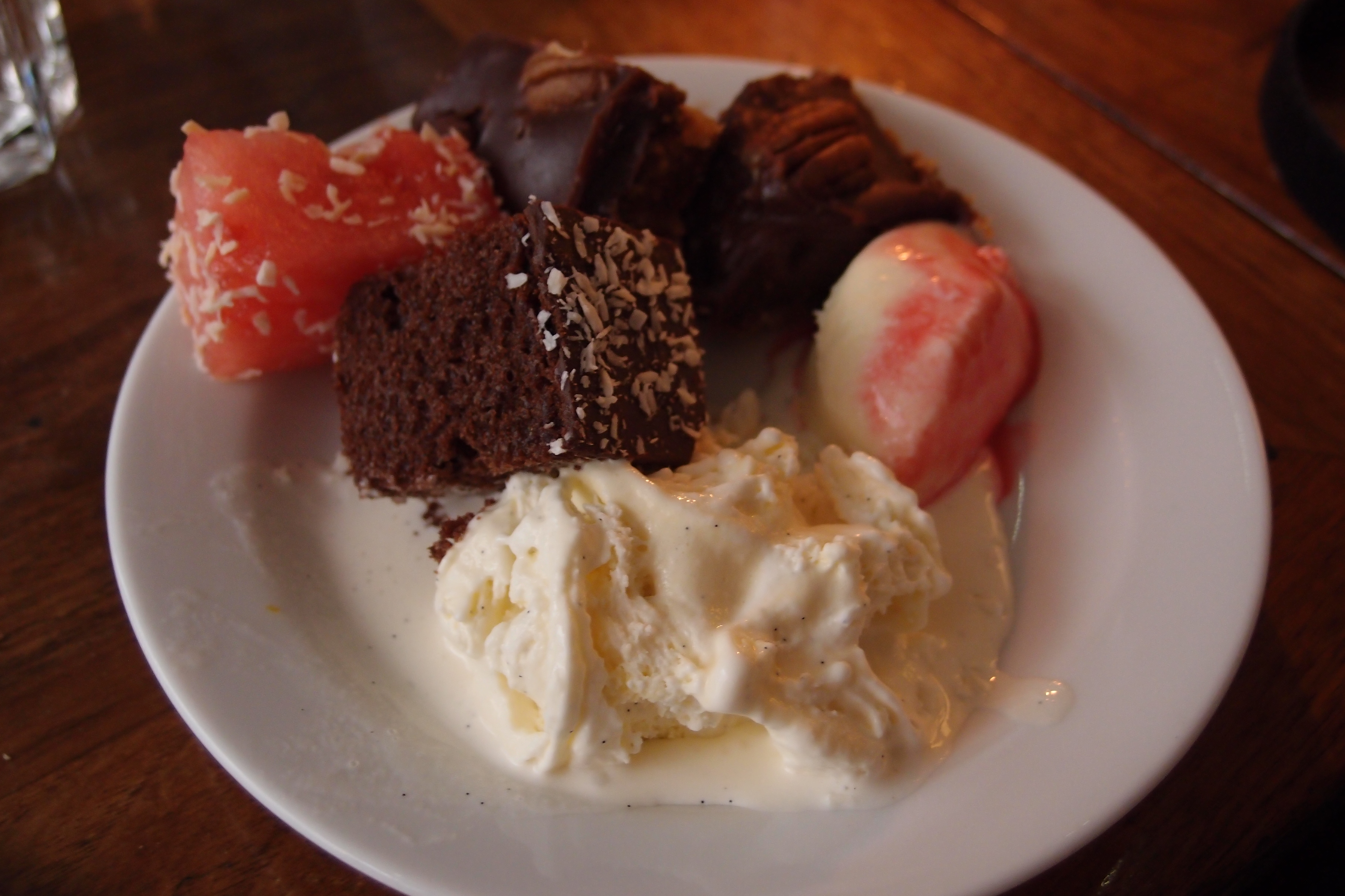 Dessertbordet då. Hjälp! Var börjar vi? ”Smaklöst och trist” får liksom sammanfatta det hela. (Vaniljpannacotta med vattniga hallon som smälter, blöter ner och färgar av sig på hela historien. Hur täcks man liksom servera det?). När jag ser menyn på nätet inser jag också att en hel del saknades när vi var där. Kanske missade vi godbitarna?