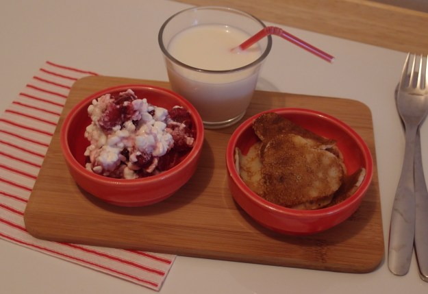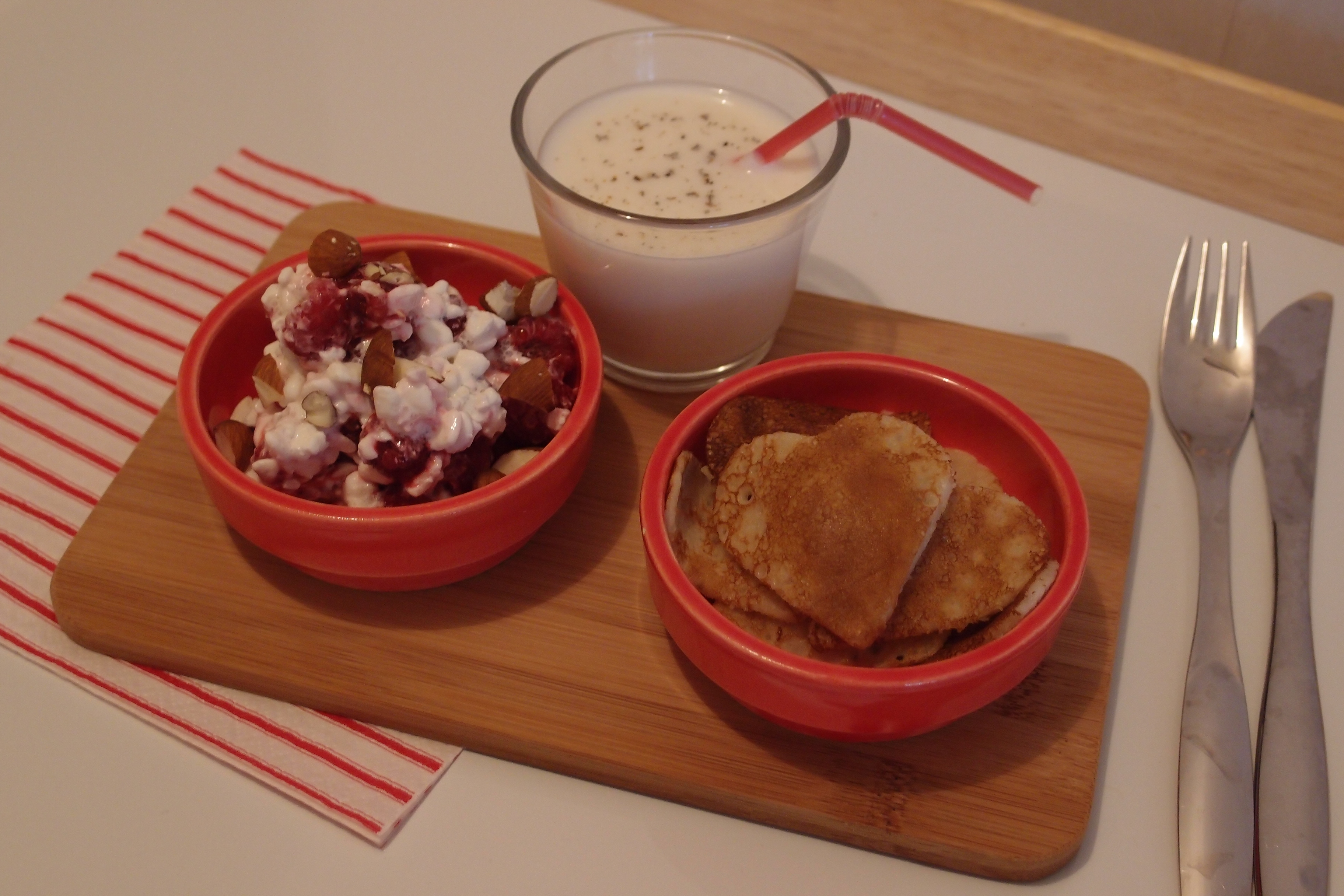 Blanda ihop keso med (lätt tinade) hallon och servera till plättarna. Strö eventuellt över lite nötter för extra tuggmotstånd.