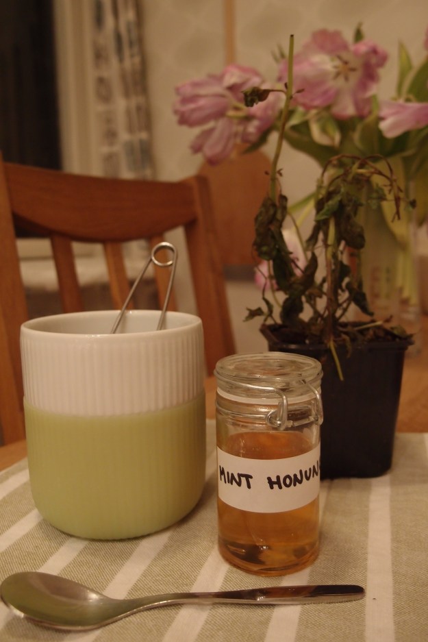 Som tur är kommer min vissna mynta till användning i tekoppen. Istället för att åka ner i soporna åker bladen ner i tesilen. Dessutom hittade jag en liten honungsburk längst in i köksskåpet. Flytande honung som jag för hundra år sedan smaksatte med apotekets pepparmintolja (mataffärens varianter brukar smaka tandkräm). Funkar ju fint som extra smaksättning!