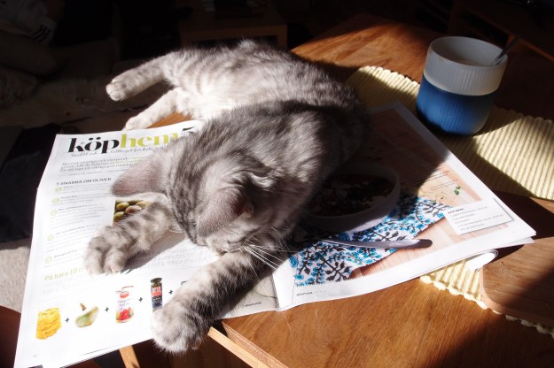Såhär såg gårdagens frukost ut. Det var underbart skönt med en varm sol i ryggen. Sitter på samma ställe idag, med samma frukost och bara väntar på att solen ska jobba sig fram mellan molnen…det ser lovande ut. Jag vill ut på långpromenad!