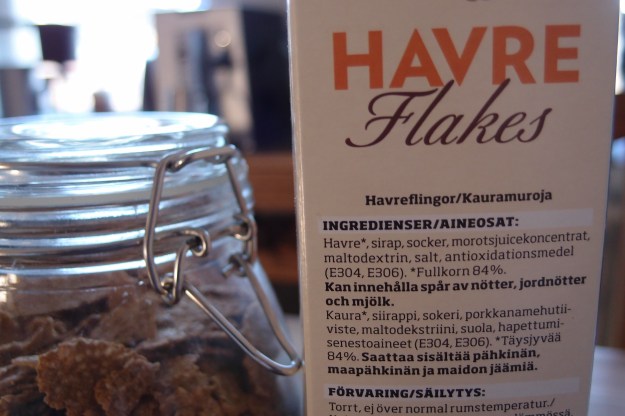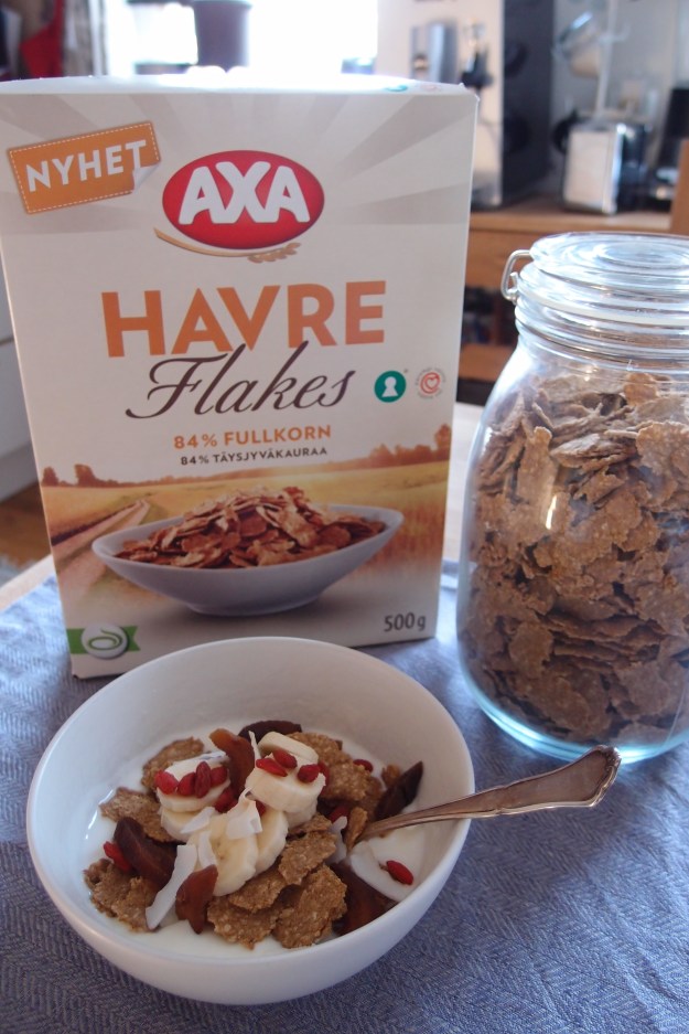 Det är inte lätt att hitta bra frukostalternativ bland affärens hyllor av flingor och müsli. Vissa sorter är verkligen rena rama lördagsgodiset med allt tillsatt socker. Oftast gör jag egen müsli fullproppad med frön, nötter och torkad frukt men variation förnöjer, så är det bara. Weetabix och Rågfras är våra vanliga frukostfavoriter. Men nu har vi alltså provat dessa; Havre flakes med 84% fullkorn.