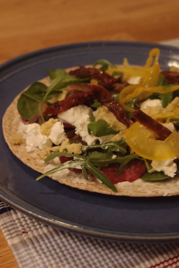 Gårdagens middag på rester. Fullkornstortilla fylld med salami, vitlöksfräst svamp, grönsaker, pesto och getost. God – i all sin enkelhet.