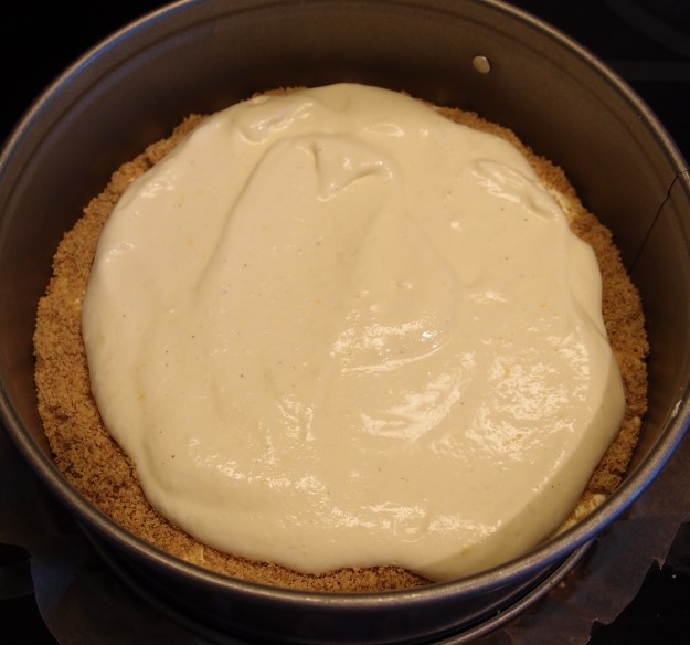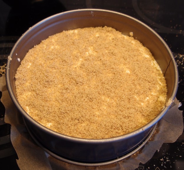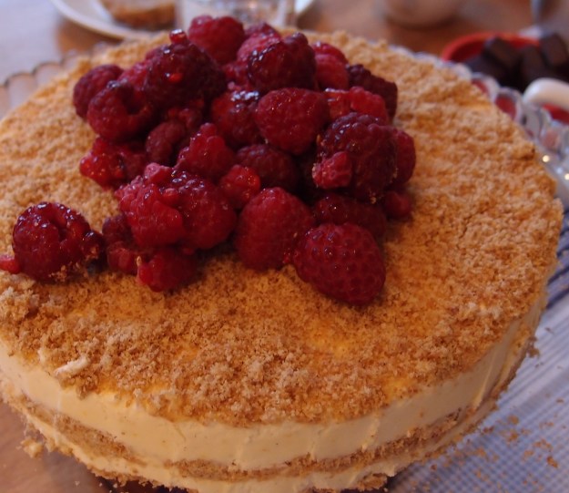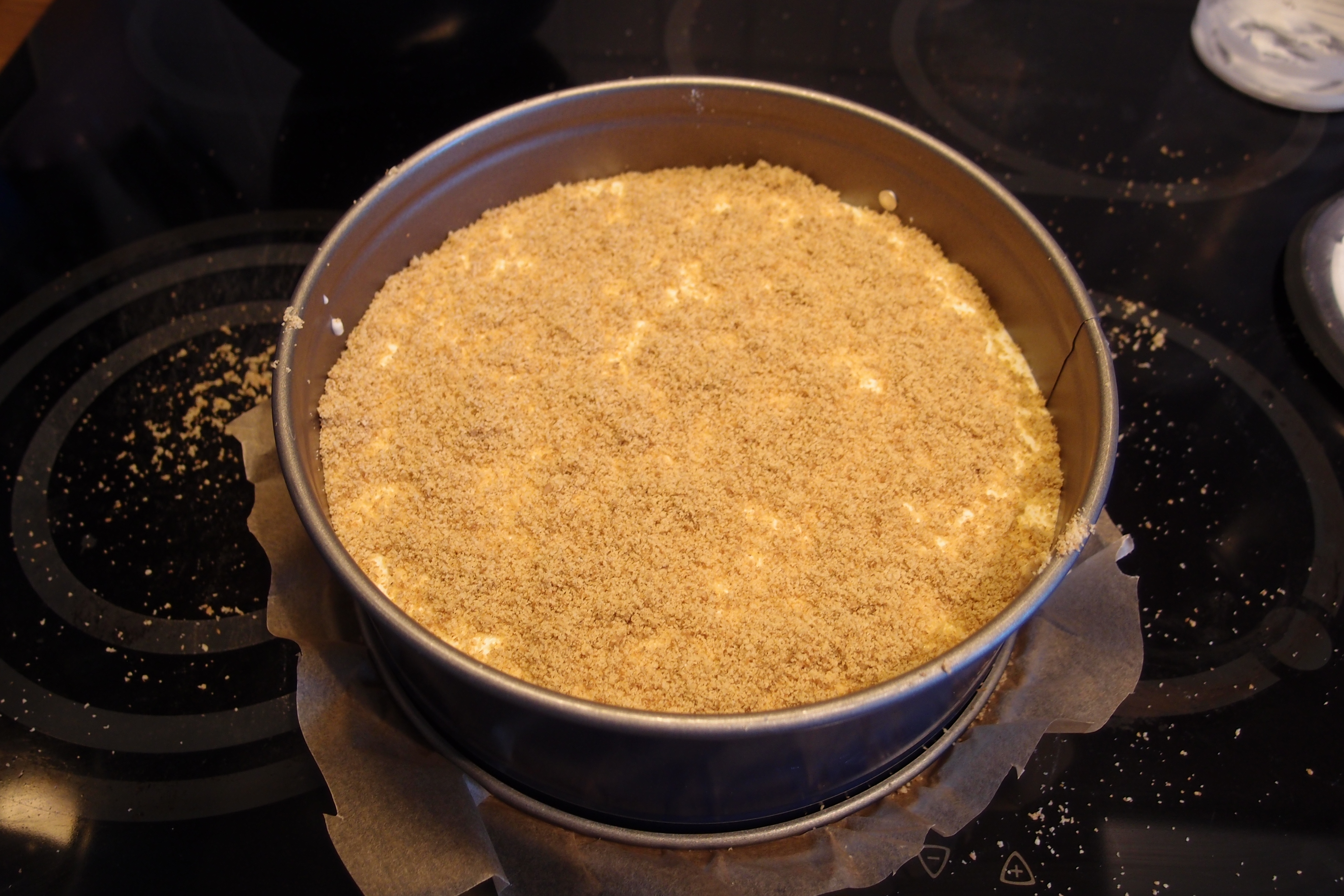 Det blir rätt fint när man varvar smet med kexsmulor. Sen kan man ju garnera mycket vackrare än så här… men vid det här tillfället hade jag liiiite tajt om tid 🙂