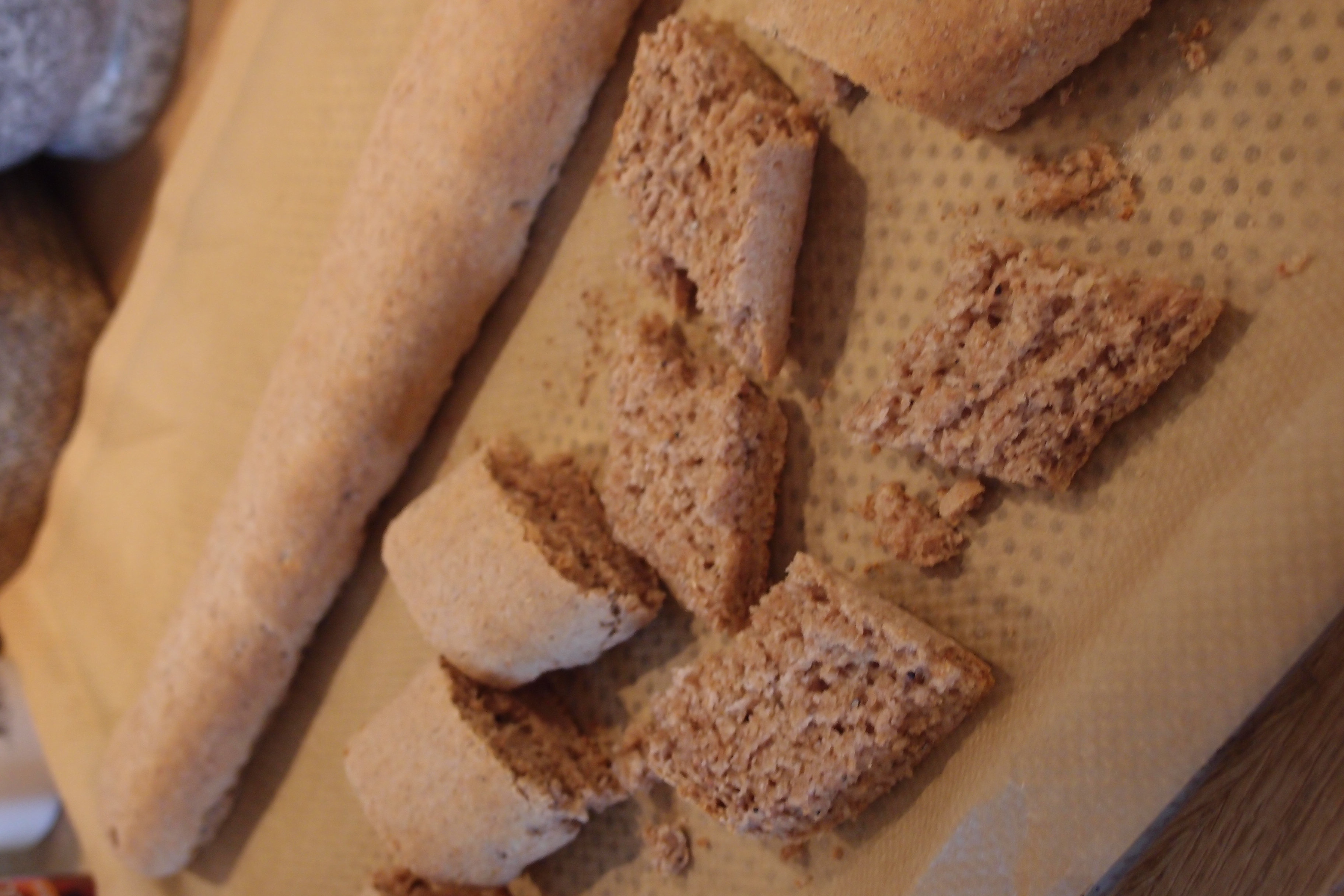 Skorporna gräddas två gånger. Först som längder, sedan skärs de i bitar, halveras och torkas klara i ugnen. Det blir lätt lite smuligt, men ingen fara, smulorna funkar fint i frukostfilen.
