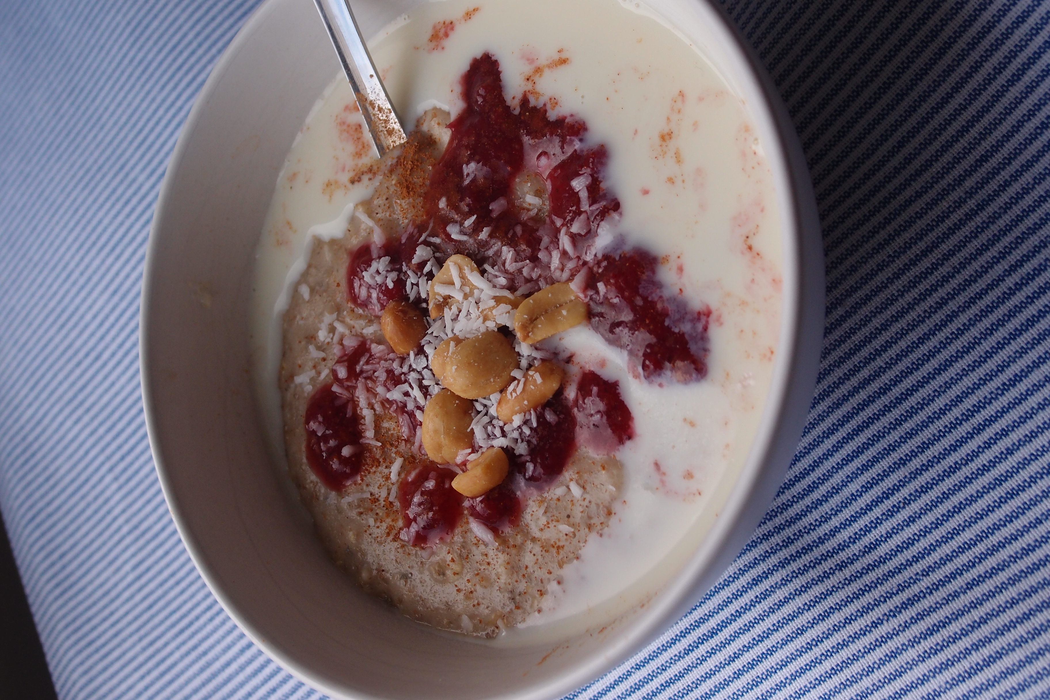 En favoritgröt kokar jag på 0,5 dl havregryn, 0,5 dl grovt rågmjöl, salt och 2,5 dl vatten. Ibland öser jag på med diverse frön och nötter, andra gånger rivet äpple men oftast med lingonsylt/lingon, kanel och sojamjölk. Förbannat gott i min värld! Nu har jag provat koka gröten med en matsked jordnötssmör och det blev faktiskt inte så dumt. Inte så nyttigt kanske men variation förnöjer. (Hemlagat jordnötssmör är löjligt enkelt att göra. Bara mixa salta jordnötter tills det blir en bredbar konsistens).