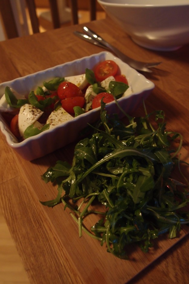 En klassiker till pastan blev det. Tomater, basilika och mozzarellaost toppat med salt, peppar, olivolja och balsamvinäger. Ruccolan blir så mycket godare om man vänder runt den i en god vinägrett, det gäller för övrigt alla salldsblad tycker jag.