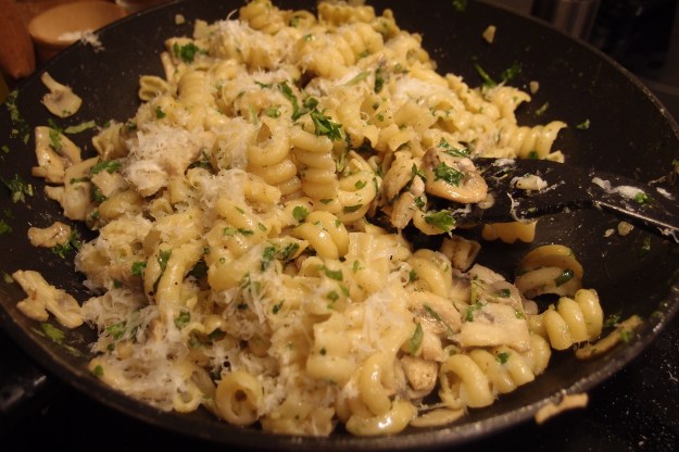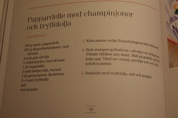 Svamp, olivolja, vitlök, persilja, parmesan och tryffelojla kan inte bli annat än supergott! Men ett litet tips är på sin plats; vänd ner tryffeloja med försiktighet, lite i taget och smaka av mellan varven. Det blir lätt alldeles för kraftig smak. Och det doftade vääääääldigt mycket tryffel i vår lägenhet kan jag meddela, trots att jag använde rätt lite.