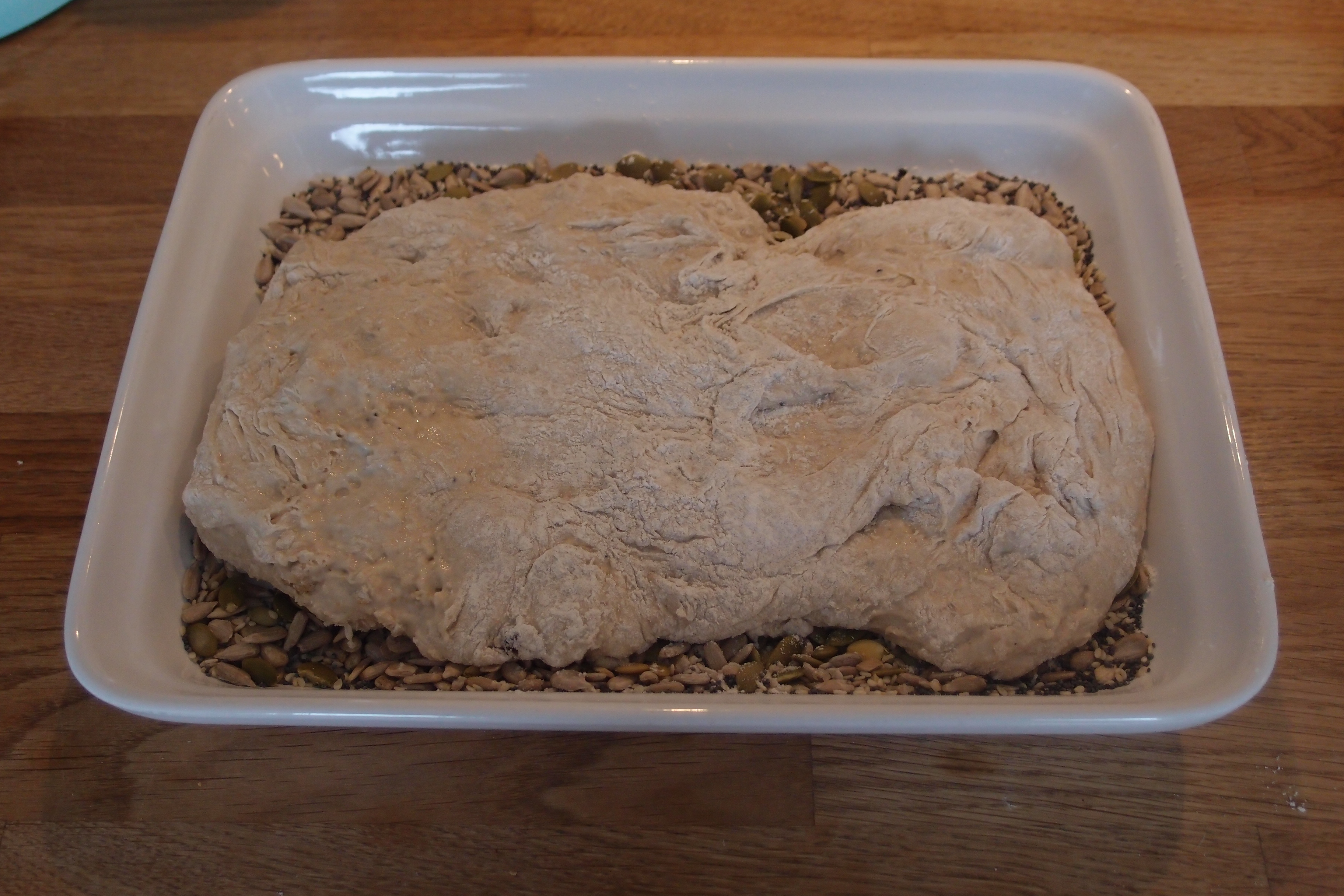 Häll ut blandade frön på en plåt eller i en form. Spraya brödets yta med vatten och vänd ner den blöta ytan mot fröna, tryck till lite lätt så allt fastnar. Lyft sedan försiktigt bort brödet, vänd frösidan uppåt och lägg brödet på en plåt med bakpapper.