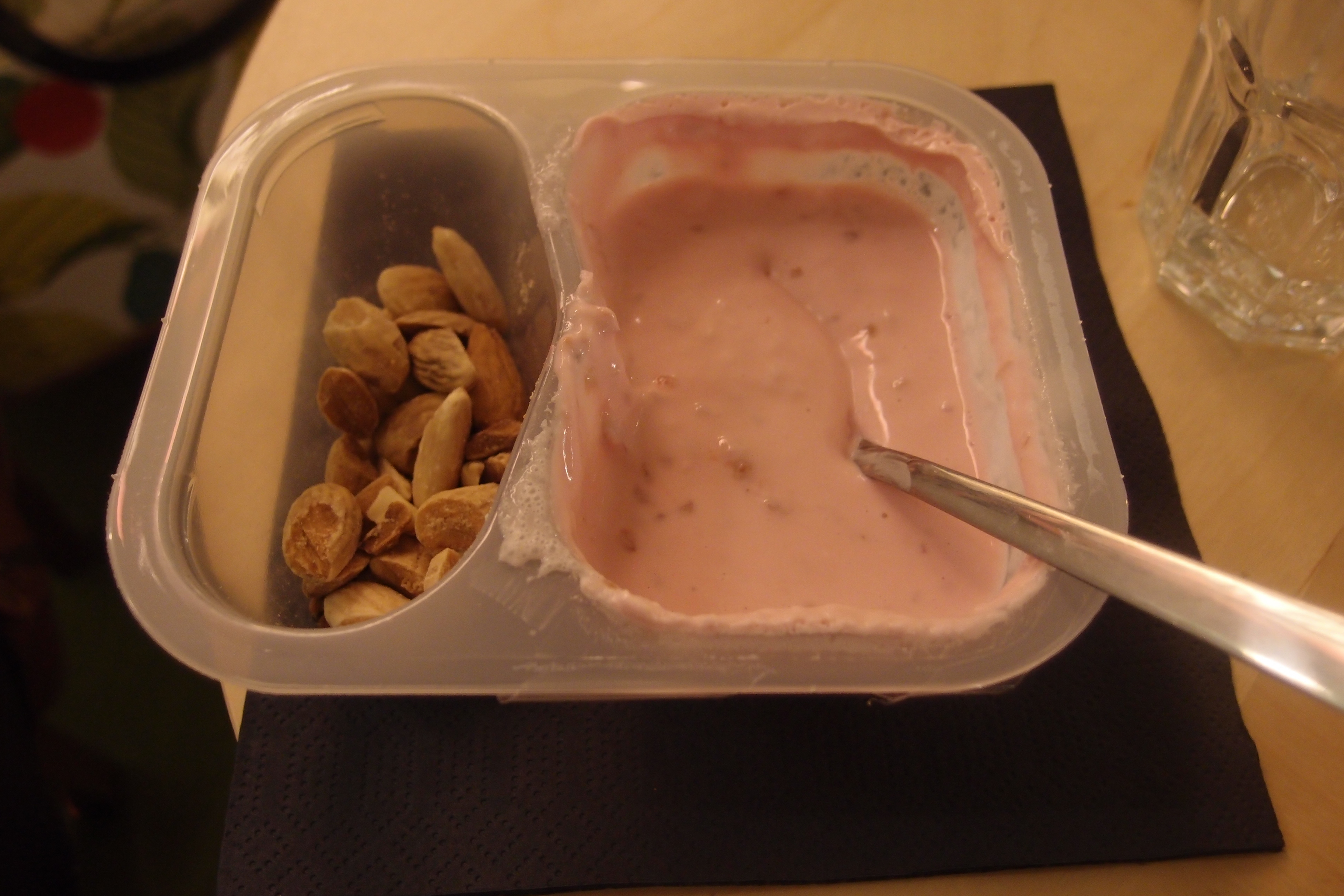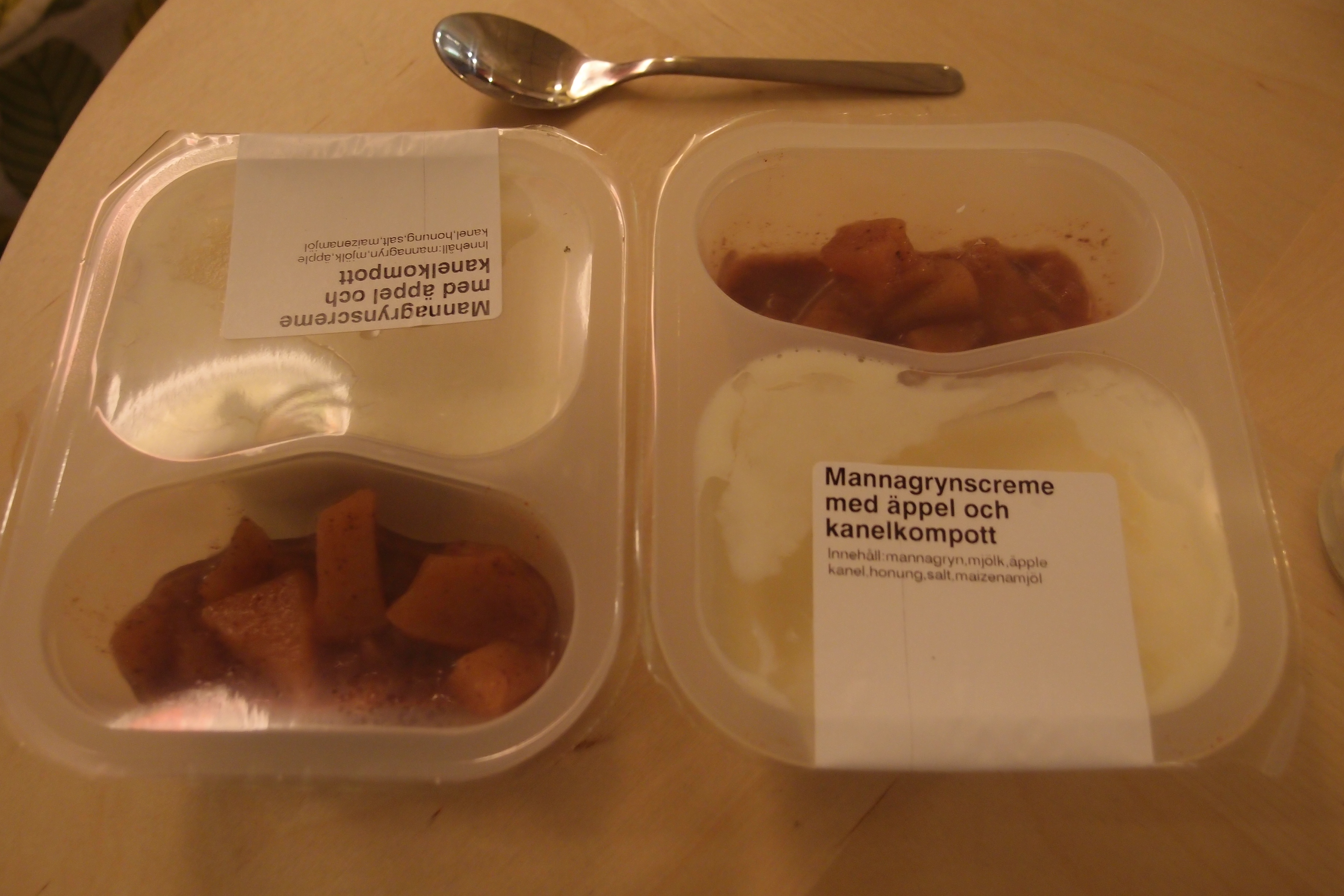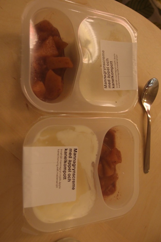 Mellanmålsdags, eller dessert för oss. Blev väldigt nyfikna på deras mannagrynscréme med äpple/kanelkompott . Tyvärr var cremén en sur besvikelse så vi fick prova hallonkesella med rostade mandlar istället. Och där blev det tummen upp, krämigt, gräddigt och gott värre!