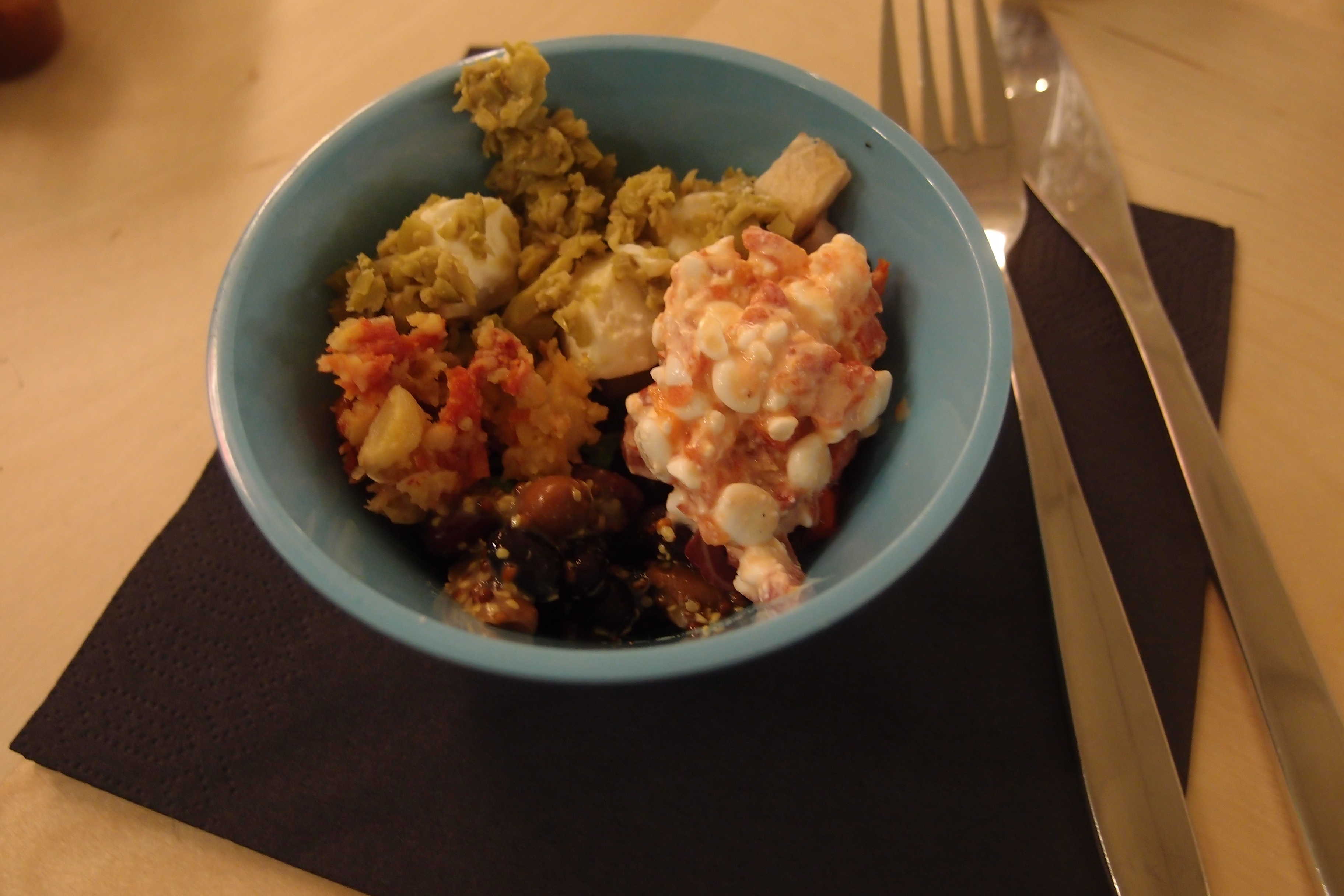 Jag uppskattar verkligen en salladsbuffé som andas nytänk och erbjuder lite annat än grönsallad med tomat, gurka och majs. Här bjöds det bland annat på keso med tomat eller majs, olivhack med fetaost, bönsallad och linsröra med soltorkade tomater.
