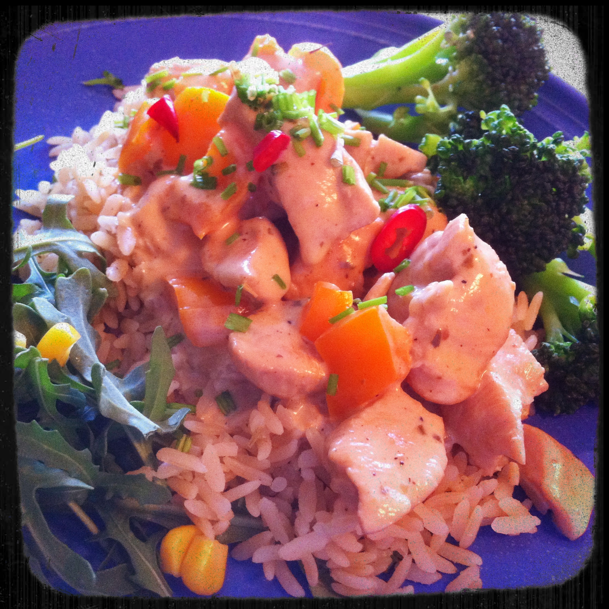 Häll över grillad ( 1 plockad) eller stekt kyckling (3-4 filéer) och skjutsa in i ugnen på 225 grader i 15-20 minuter eller gör som jag; låt såsen puttra med den stekta kycklingen i stekpannan tills den reducerats lite. Jag tillsatte faktiskt en paprika också eftersom den sjöng på sista versen.