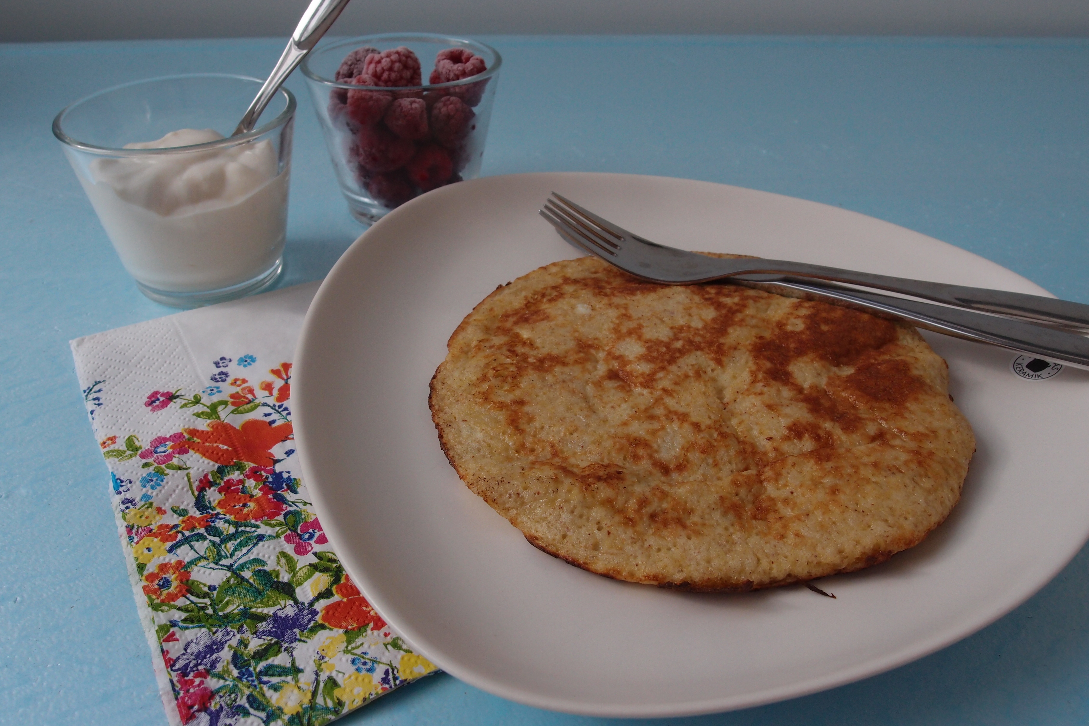 Det här smakar banan och är lite äggigt i konsistensen (förvånande va?!) men det smakar förvånansvärt gott. 🙂 Jag serverade det med hallon och kvarg blandat med grädde, vanilj och agavesirap.