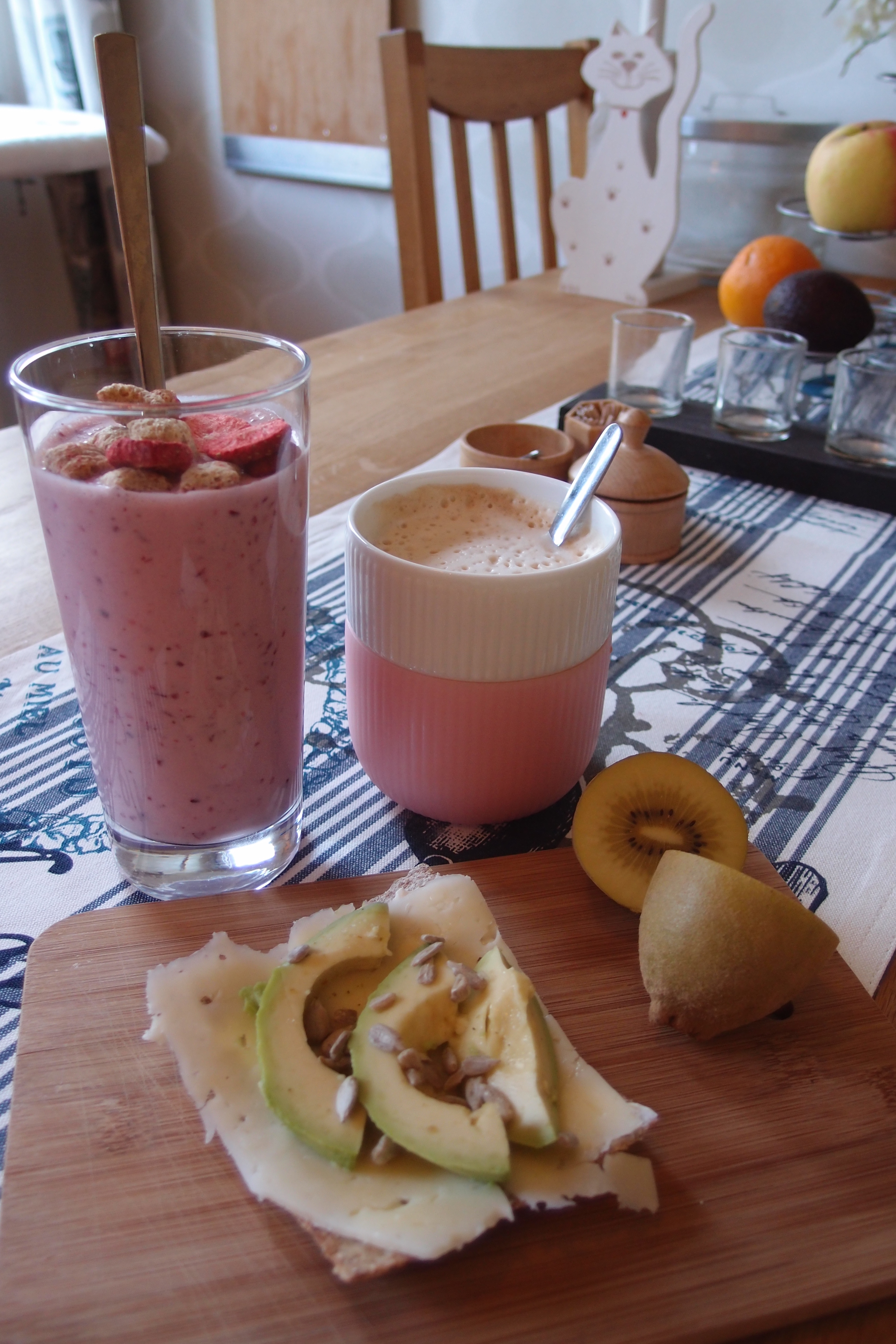 Onsdagens frulle såg ut så här. Favorit knäcke med färskost, hårdost, avokado och solrosfrön samt en smarrig smoothie mixad på vaniljyoghurt, banan, lingon, havrekli, vanilj och kanel. Kanongod start på dagen!