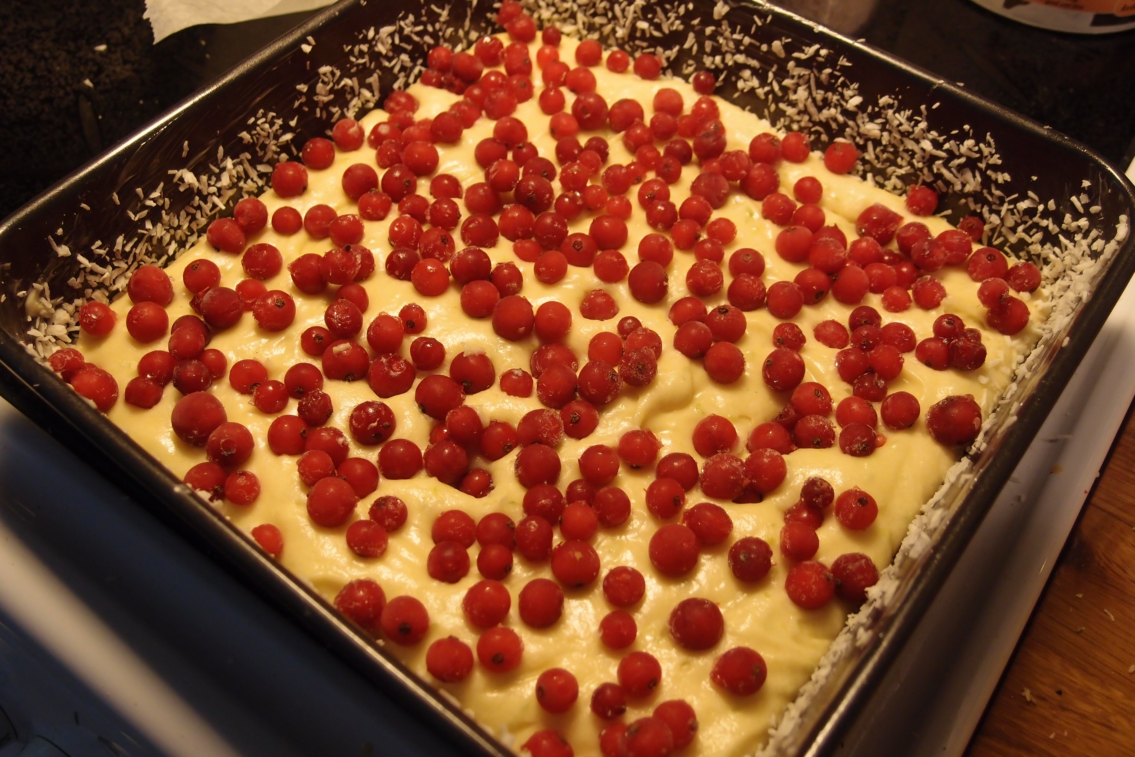 Hej! Gjorde kakan förra veckan och den blev superbra. Vi har vinbär i trädgården så jag letade på nätet efter något bra recept, hittade ditt och blev direkt intresserad, det var kombinationen av sött och syrligt som lät så spännande, gillar inte när det blir för sött. Den fick sedan mycket beröm av alla i familjen som smakade på den. En lite fadäs jag gjorde var att jag efter halva gräddningstiden kom på att jag glömt lägga i bären men det gick bra ändå, de hann sjunka ned.