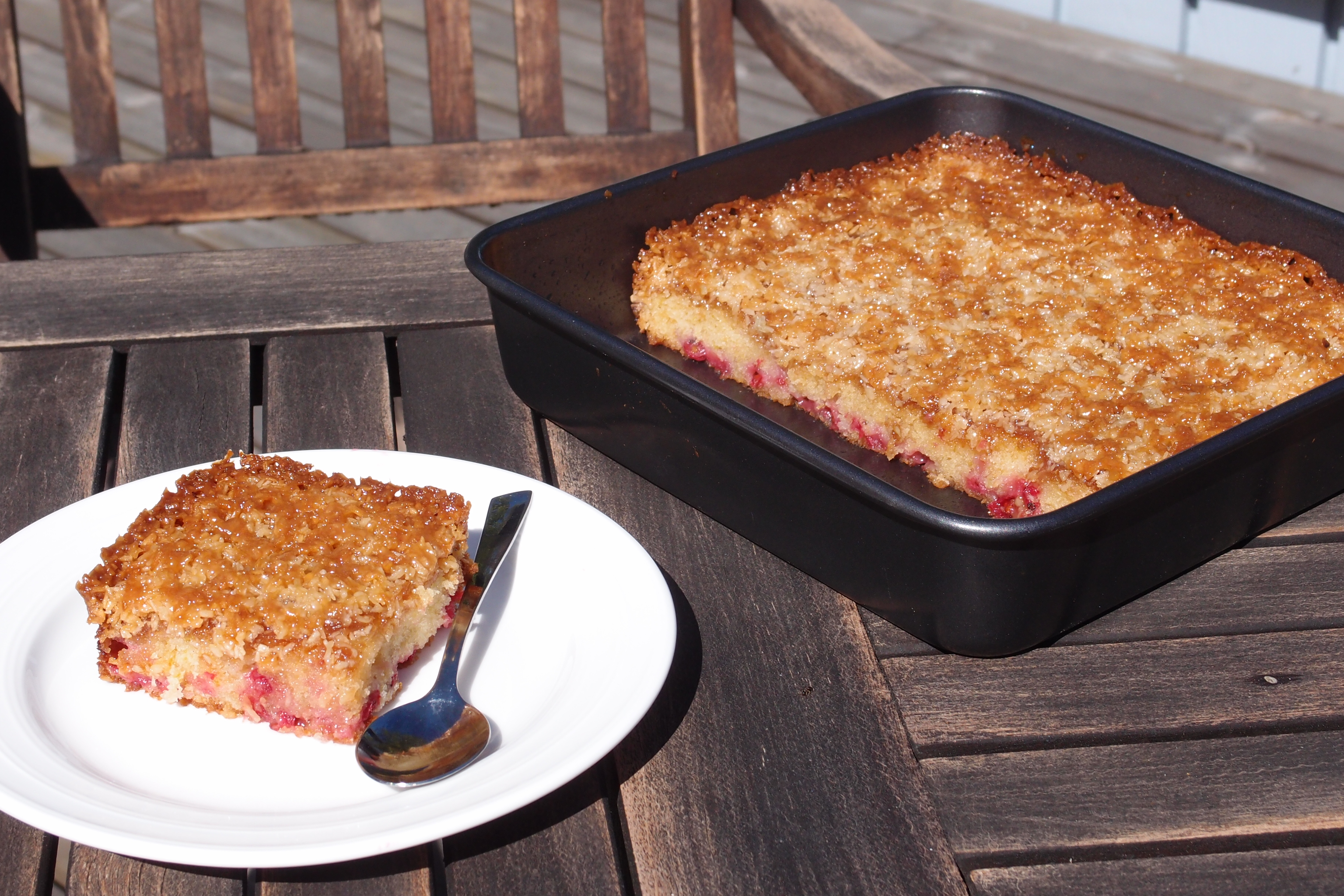Kokostosca gör det hela väldigt sött så därför passar lime och röda vinbär perfekt som sällskap. Frysta bär passar utmärkt, de behöver inte tina först. Var inte rädd för att baka med salt. Jag lovar, det gör allt mycket mer balanserat och framhäver smakerna. Röda vinbär kan ersättas med rabarber om man föredrar det, då går det åt 2-3 skalade stjälkar, skurna i skivor.