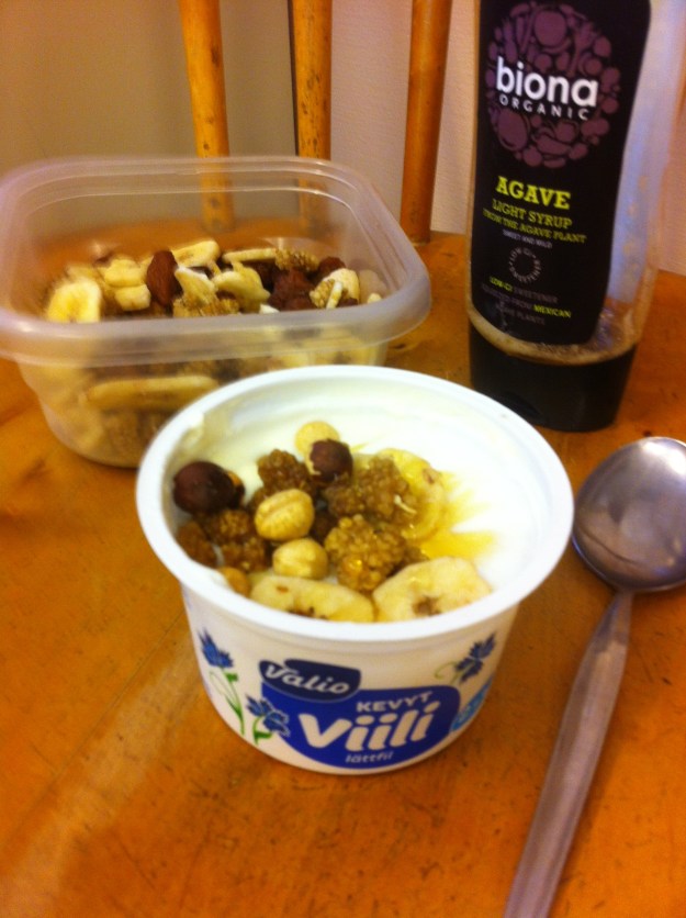Idag fick filbunken agera mellanmål tillsammans med agave sirap, hasselnötter, torkade bananchips och mullbär (båda utan socker eller andra tillsatser. Du hittar dem här). Självklart toppade jag med kanel. Det här måste jag äta oftare.