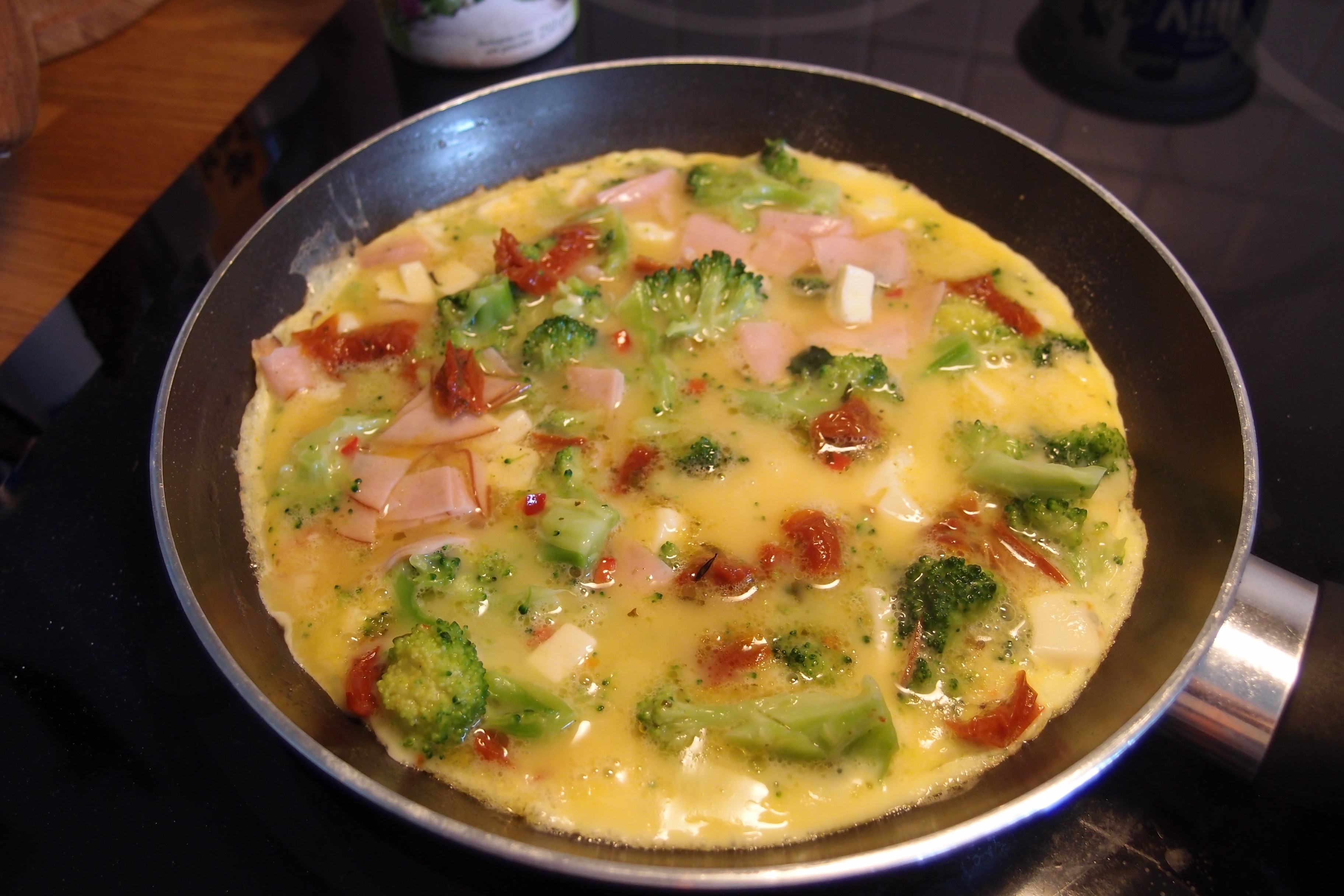 När jag kom hem från Åland ekade kylen tomt och den sena kvällen var kommen..(alltså fanns det ingen ork för att handla..). Men man behöver inte så mycket ingredienser för att kunna knåpa ihop en god omelette till lunchlådan. På två ägg och en skvätt vatten blev det en omelette med Koskenlaskija (ost), snabbkokt broccoli, rökt skinka, chili, soltorkad tomat och örtsalt. Jag brukar grädda på medelvärme tills ytan nästan har satt sig, sedan vänder jag omeletten och stänger av värmen. Då blir det krämigt och gott! Lunchen räddad.
