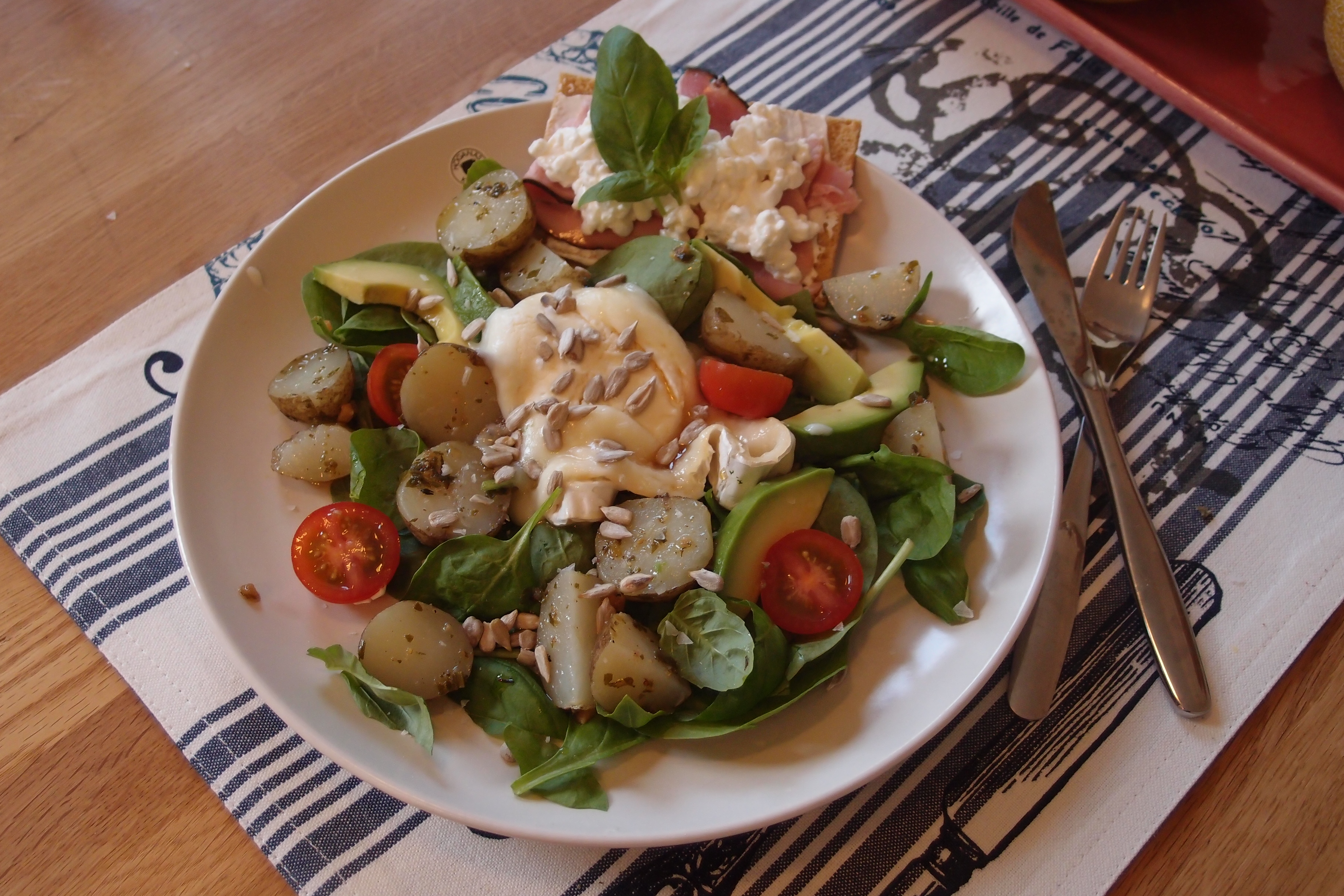 Efter en stressig dag på jobbet och ett hårt pass utomhus Boot Camp måste maten fram i rekordfart. Daniel kokade nypotatis medan jag trampade hemåt så salladen tog inte många sekunder att vända ihop.