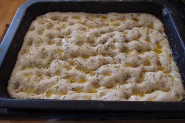 Olivolja, flingsalt och torkad rosmarin till plåten och utbakning