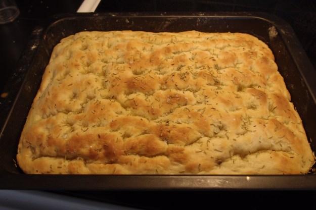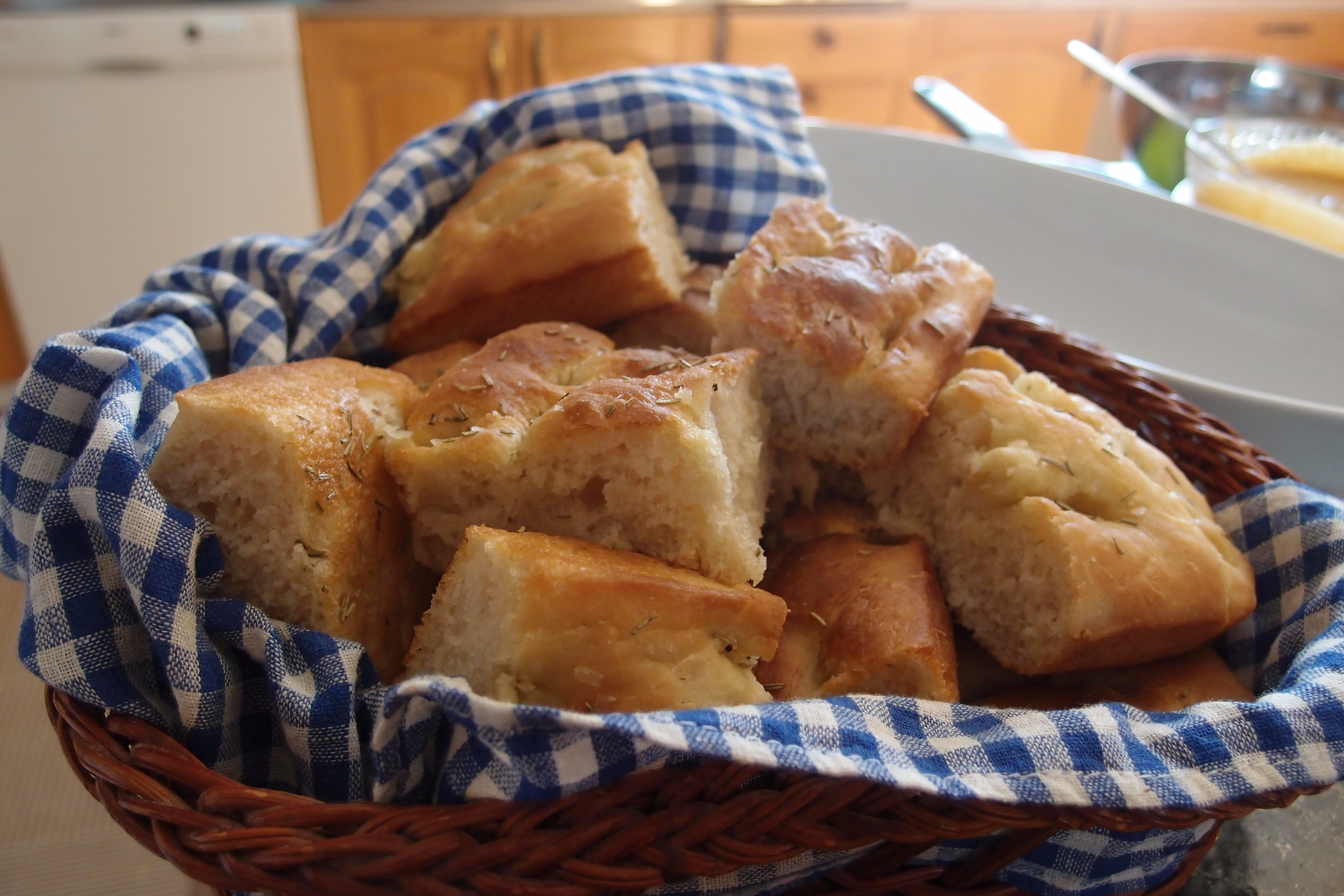 Det är inte ofta jag föredra vitt bröd framför mörkt men till en god grillmiddag sitter focaccia fint! Det här brödet bakade jag förra veckan. Det blev en enkel variant med flingsalt och lite torkad rosmarin. Trevligt på midsommarbordet eller buffén är det också. Grundreceptet är Leilas.