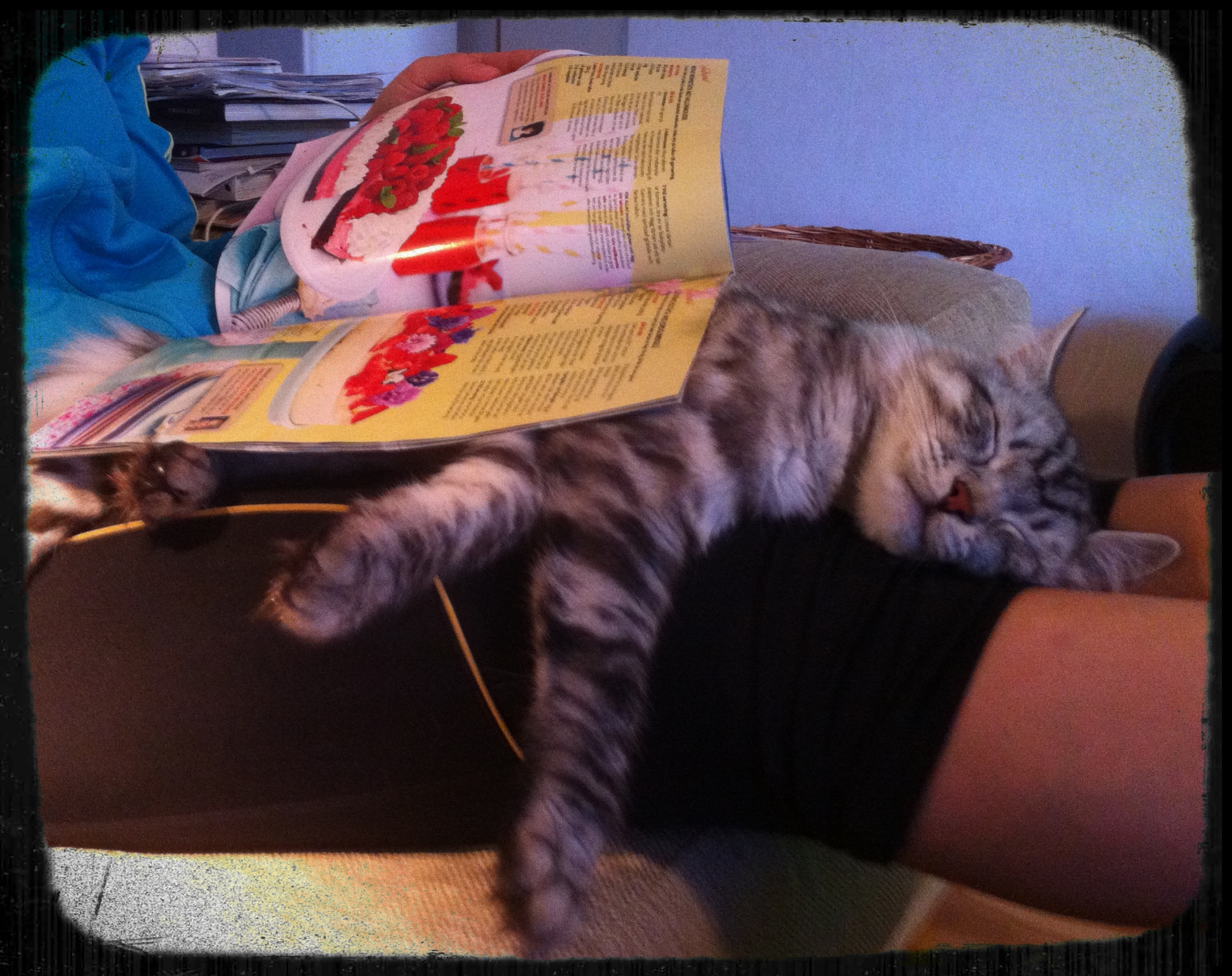 …så här ser det ut hos oss just nu. Kokos i famnen (i vanlig ordning) och jag bläddrar i senaste numret av buffé (ICA:s stamkundtidning). Ser lovande ut, vill prova massor av recept!