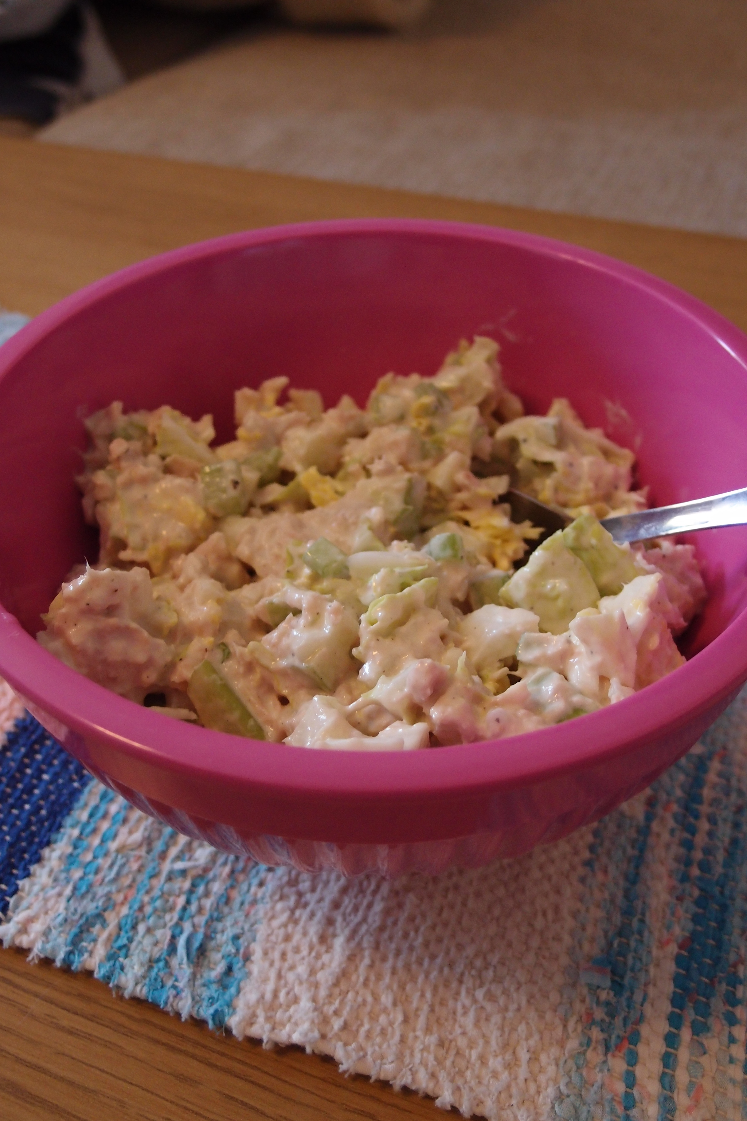 Blanda 1 burk avrunnen tonfisk med 0,5 finhackat äpple (Granny smith), 1 finhackad stjälk selleri och 1-2 nävar strimlad salladskål. Vänd runt med lika delar majonäs och gräddfil/crème fraîche tills det binder ihop röran. Smaka av med salt och citronpeppar. Lite citron eller tabasco är också gott som smaksättning.