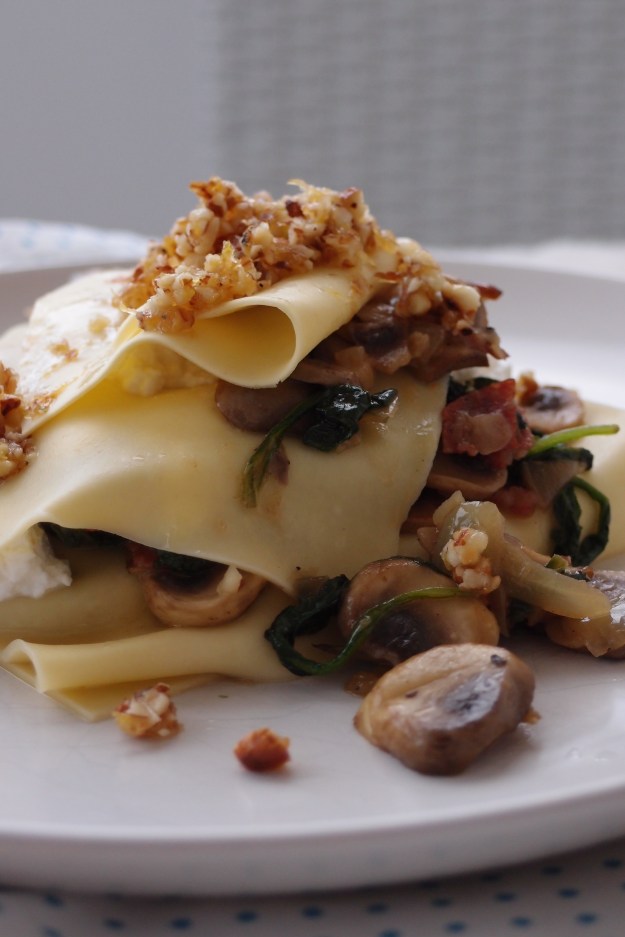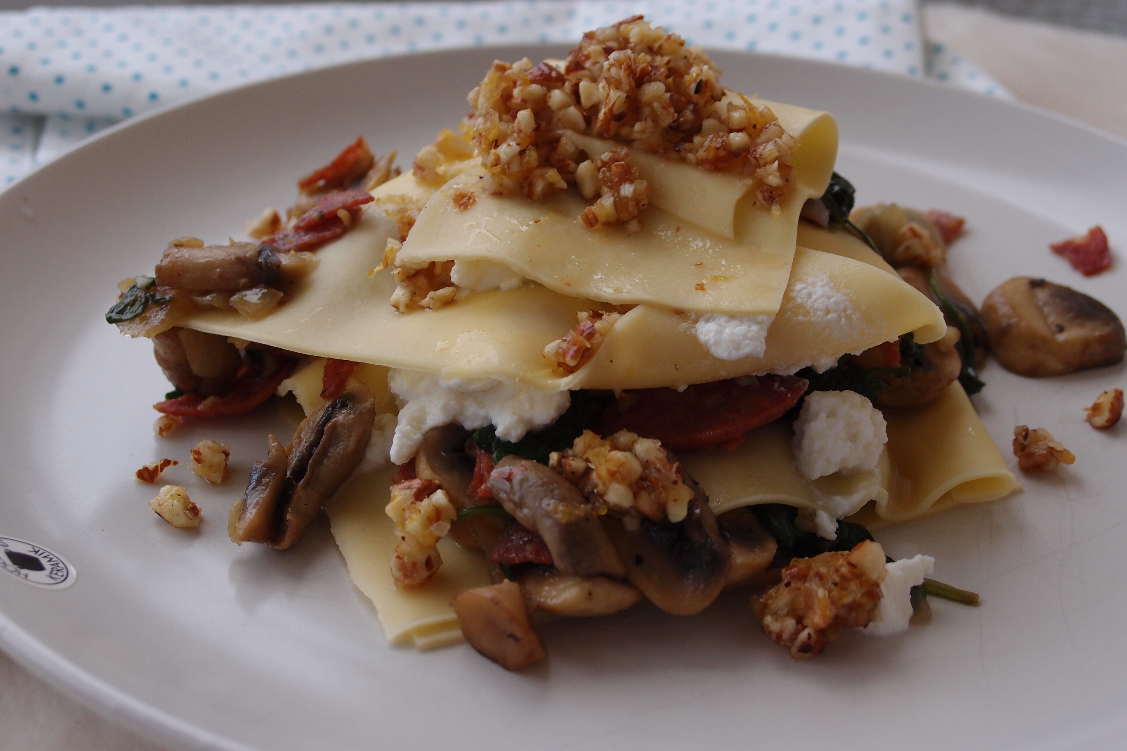 Varva lasagneplattor direkt på tallriken med svampröran och klickar av ricotta ost. Avsluta med lasagneplatta och citronmandel pesto.