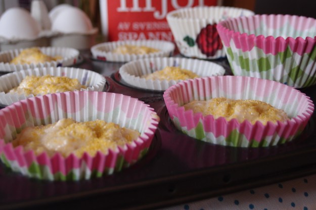Sätt ugnen på 200-225 grader. Nyp ihop mjöl, salt och siktat bakpulver med smör till en grynig massa. Blanda ner mjölken och den mosade bananen och fyll 7 muffinsformar (ställ gärna formarna i en muffinsplåt) till 2/3 med smeten. Toppa med lite polentagryn och grädda runt 10 minuter. Frys in scones som inte äts samma dag.