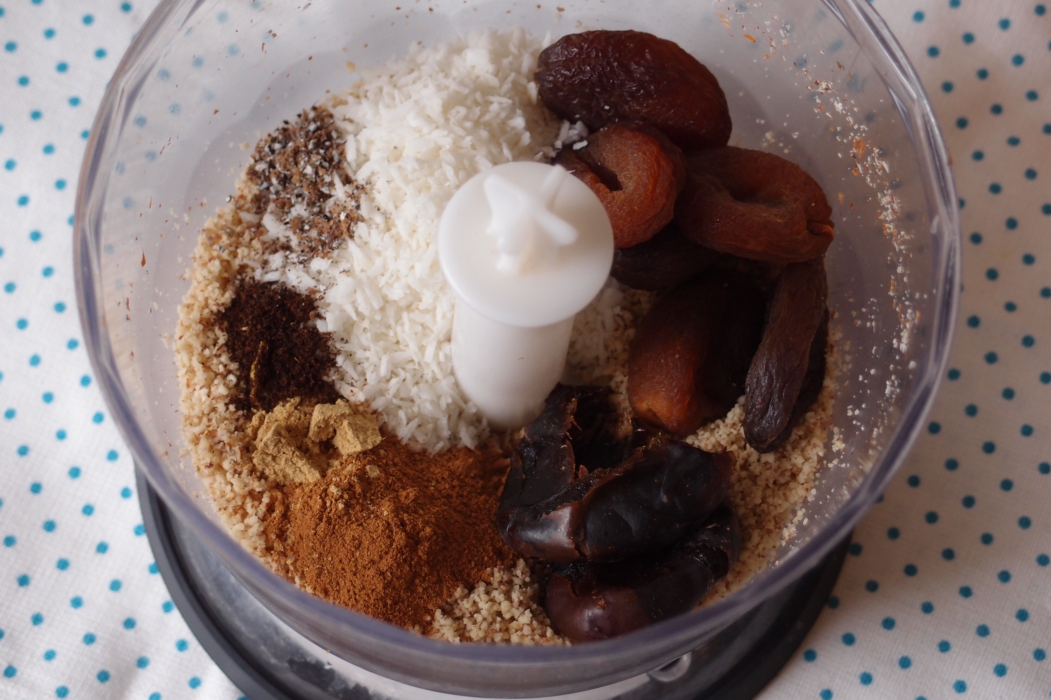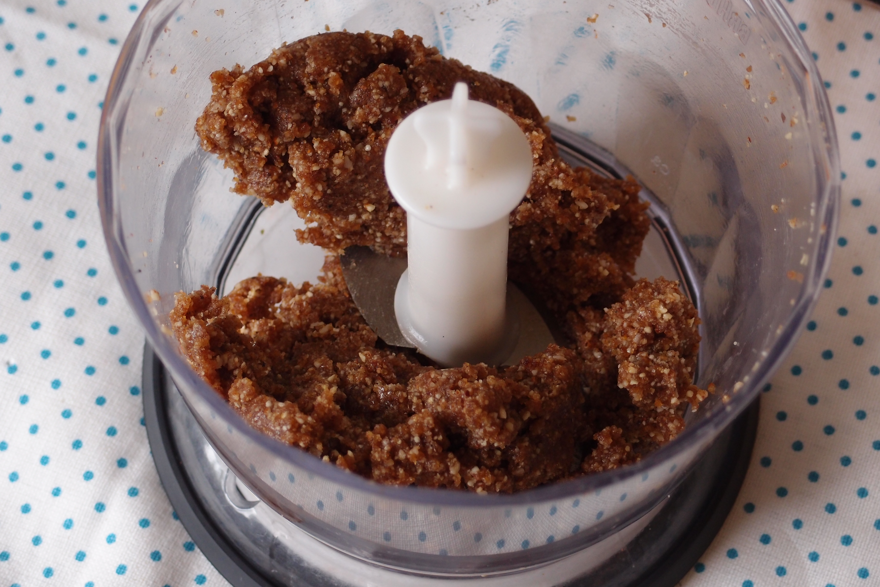 Mixa dina favoritnötter fint och tillsätt kryddor och torkad frukt. Mixa tills du har en kletig röra. Men mixa inte för länge, då kryper fettet ur nötterna ut.