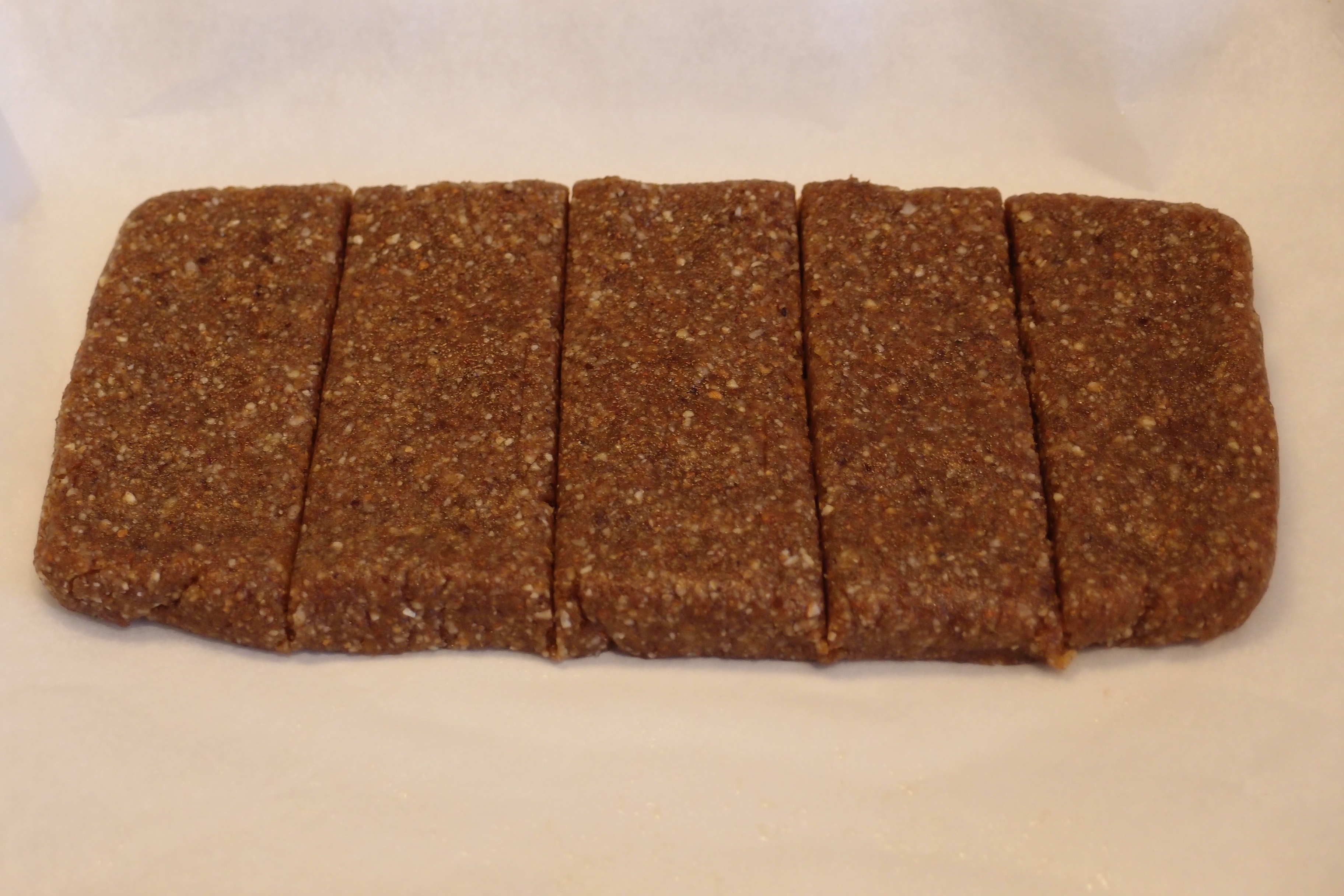 Mixa nötterna. Tillsätt resten av ingredienserna och mixa tills du har en formbar smet. Forma till en rektangulär platta, ca 1 cm tjock och skär ut bars och grädda i 125-150 grader i ca 30 minuter.