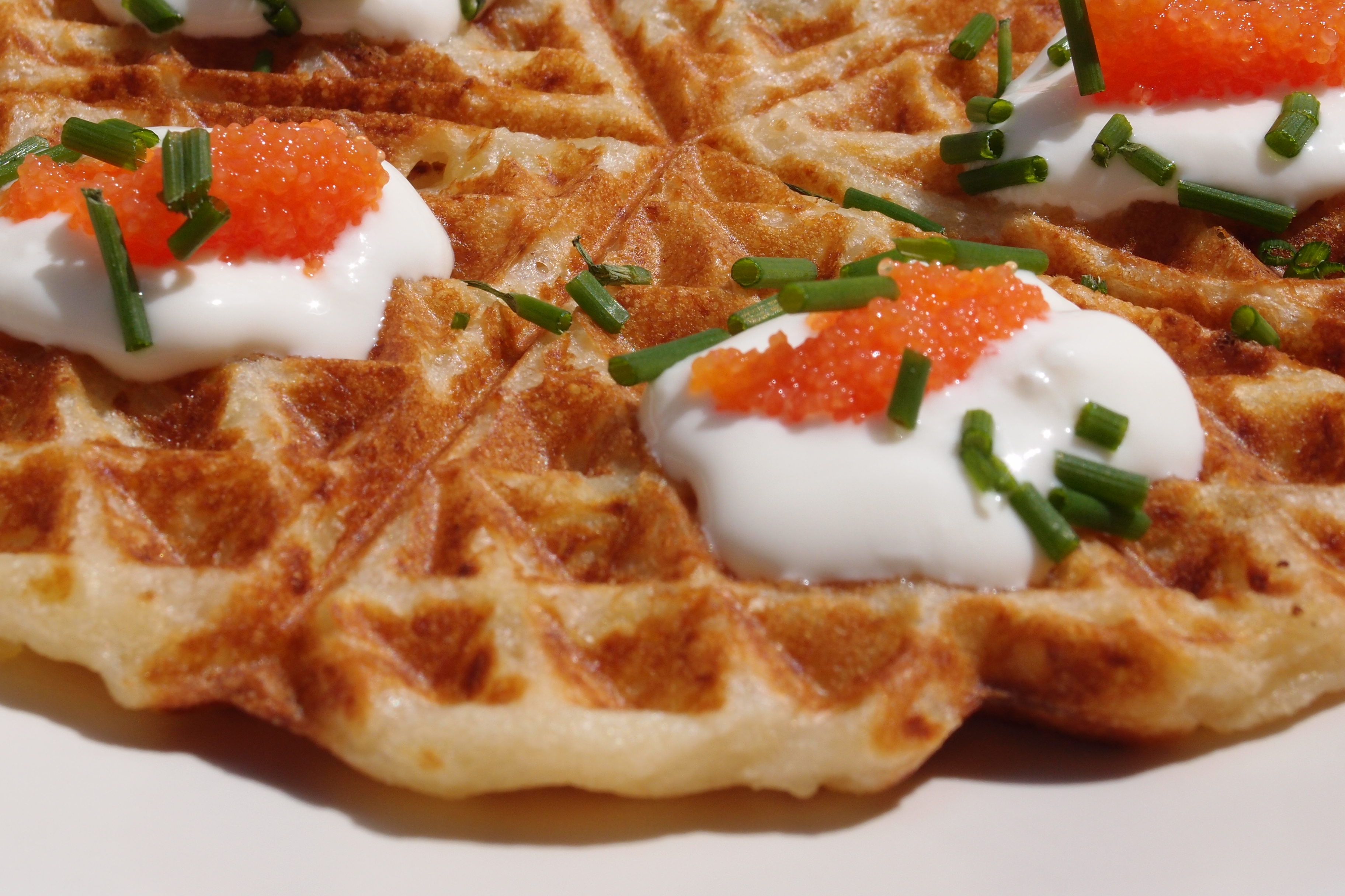 På tal om potatis och våffeljärn så gjorde jag tidigare potatisvåfflor. Lite matigare  och mäktigare än vanliga våfflor och med en aningen segare konsistens. Det var bara att riva ner rå eller kokt potatis i våffelsmeten och grädda. Enkelt och gott, speciellt med gräddfil, löjrom och gräslök.