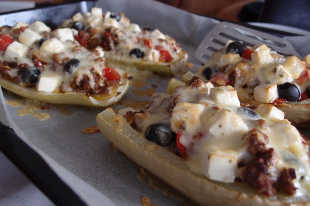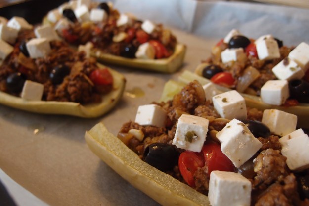 Sätt ugnen på 175-200 grader. Tvätta och halvera zucchinisarna på längden. Gröp ur kärnhuset och skär bort lite av den rundade bakdelen så ”båtarna” kan ligga stadigt. Pensla dem med olja och grädda ca 30 minuter tills de känns mjuka. Finhacka löken och stek den mjuk och glansig i olja/smör. Stek på färsen, tillsätt urgröpet ur frukten och kryddorna. Hacka ner tomater/paprika och låt såsen puttra tills smakerna satt sig och vätskan kokat bort. Fyll båtarna med röran, toppa med fetaost och oliver och strö över riven ost. Gratinera runt 5 minuter tills osten smält.