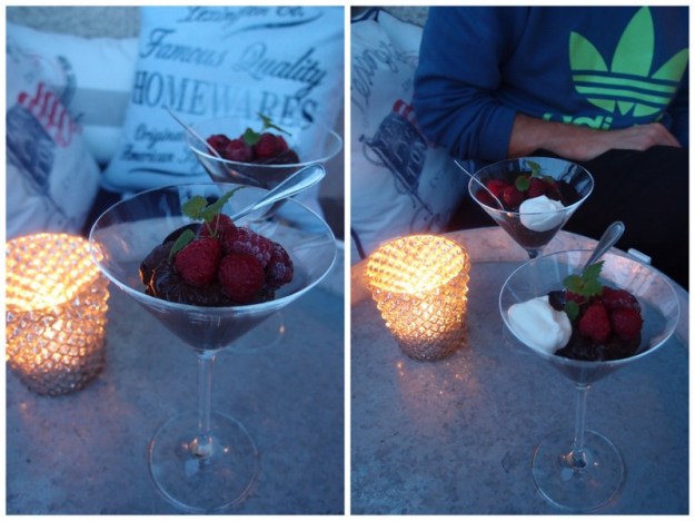 Jag serverade med hallon och citronmeliss, supergott! Och okej då, en liten klick vaniljgrädde. Det får ju vara någon måtta på nyttigheterna. 🙂