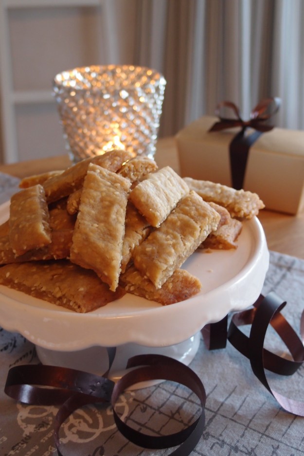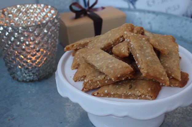 Blanda/mixa ihop smör, socker, sesam, sirap och vaniljsocker. Blanda ner mjöl, bakpulver och salt och forma till en deg. Rulla ut två fingertjocka längder på en plåt med bakplåtspapper. Grädda i nedre delen av ugnen 8-10 minuter. Puffa in kanterna med sidan av en kniv så att längderna inte blir för platta. Låt svalna en aning och skär i snitt. (Går utmärkt att frysa in men kan också förvaras i rumstemperatur i en försluten burk).