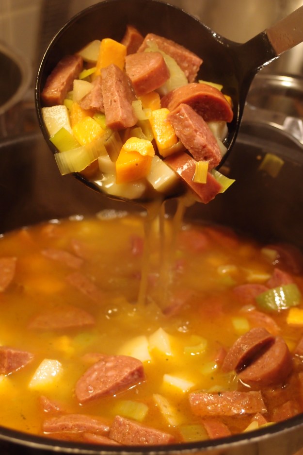 Hur som helst, korvsoppa är simpel matlagning. Hacka purjolök, olika rotfrukter (sötpotatis, palsternacka, morot, rotselleri) och korv i mindre bitar. Täck med vatten, smaksätt med grönsaksbuljong och peppra efter behov. Har man tid kan man fräsa lök och korv först, innan rotfrukterna tillsätts. Mycket mer behövs inte men krydda valfritt kan man ju alltid göra.