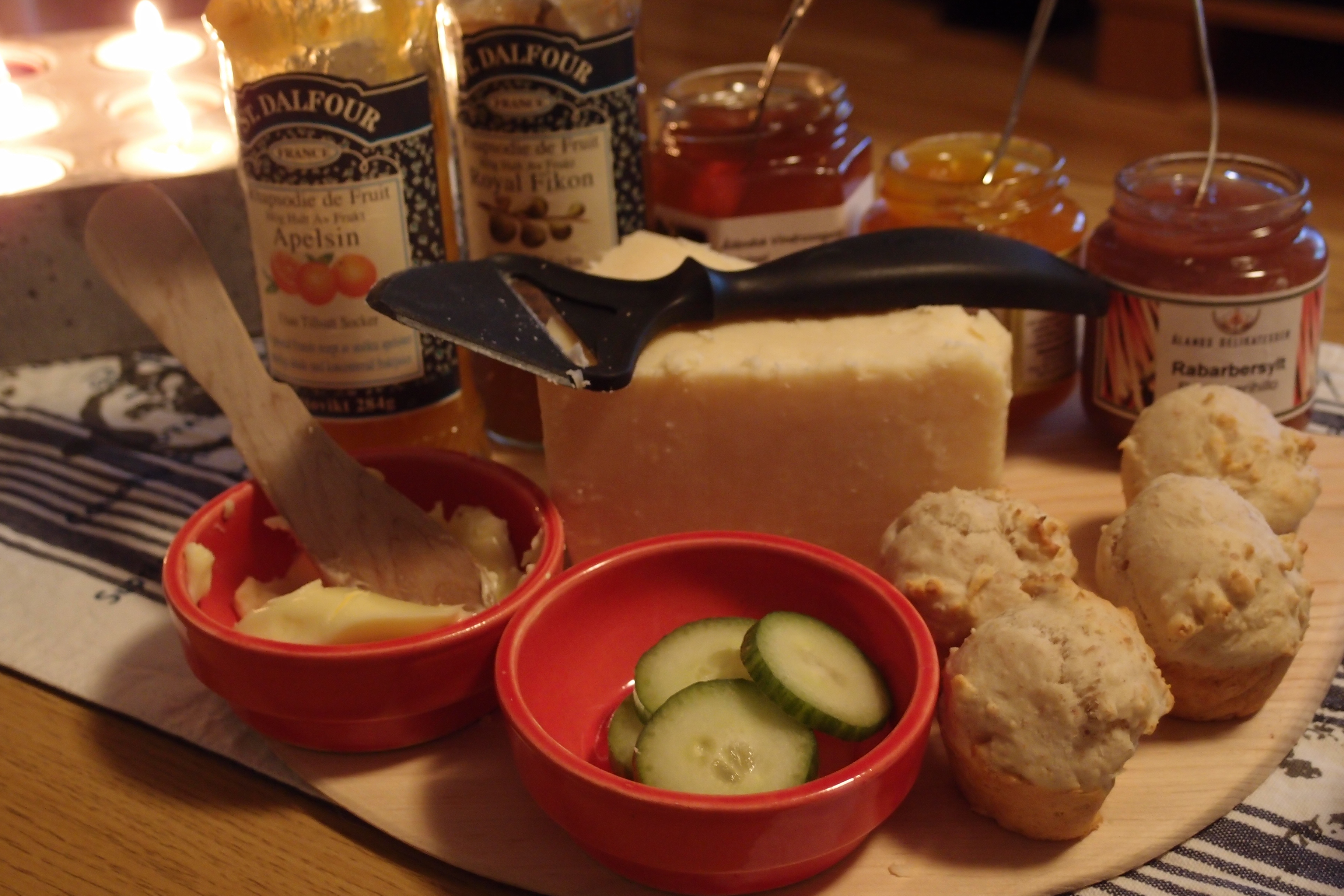 Som tur var kunde jag svalka tungan med scones…. Jag utgick från mitt eget recept, ni hittar det här. Eftersom jag fick en underbar present av fina M tidiagre, fylld med åländska produkter som gelé, marmelad och sylt så passade jag på att duka upp en liten provsmakningsbuffé. Vindruvsgelé var en spännande nykomling och havtorsmarmelad är alltid uppfriskande.