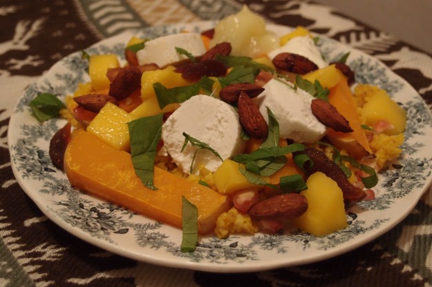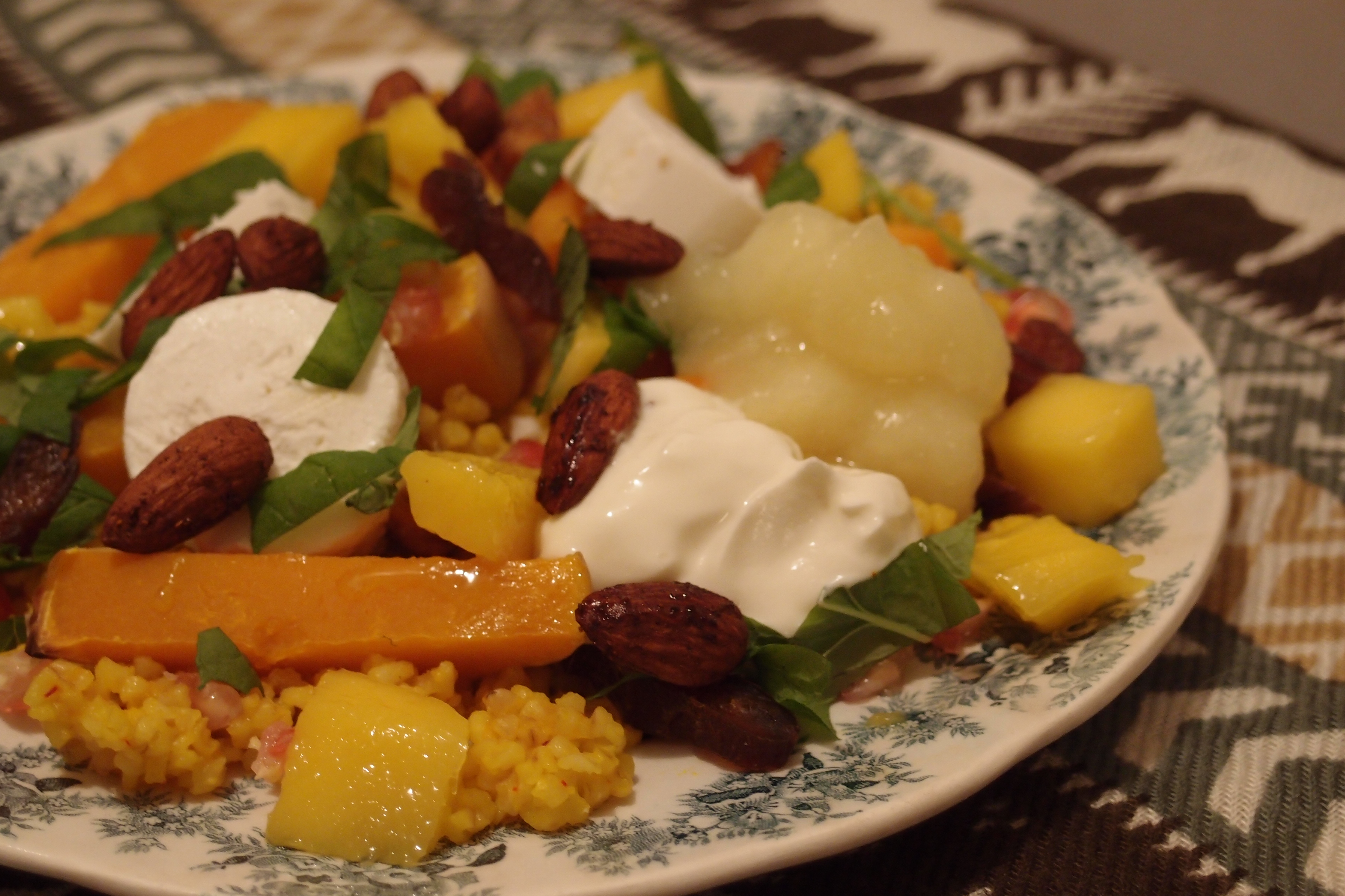 På tallriken har jag saffransbulgur, ugnsbakad pumpa, krämig chevré, mango, torkade (osvavalade) aprikoser….