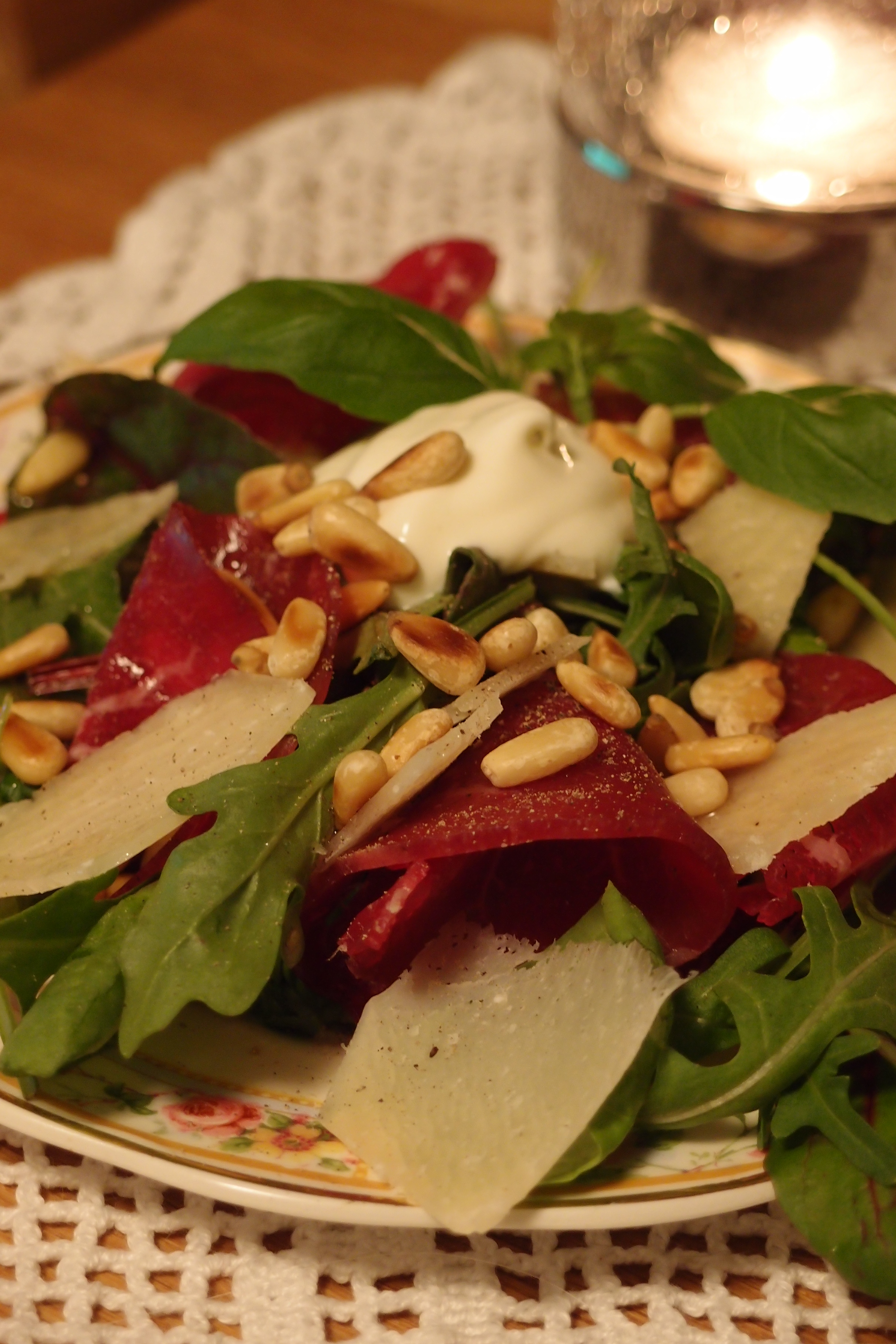 Tryffel är verkligen urgott och ger en intressant och lyxig smak som lyfter den här salladen till högre höjder. Här samsas ruccola, bresaola (lufttorkat mört nötkött), parmesan, rostade pinjenötter och en tryffelkräm (crème fraîche med några droppar tryffelolja). Mmmmm!