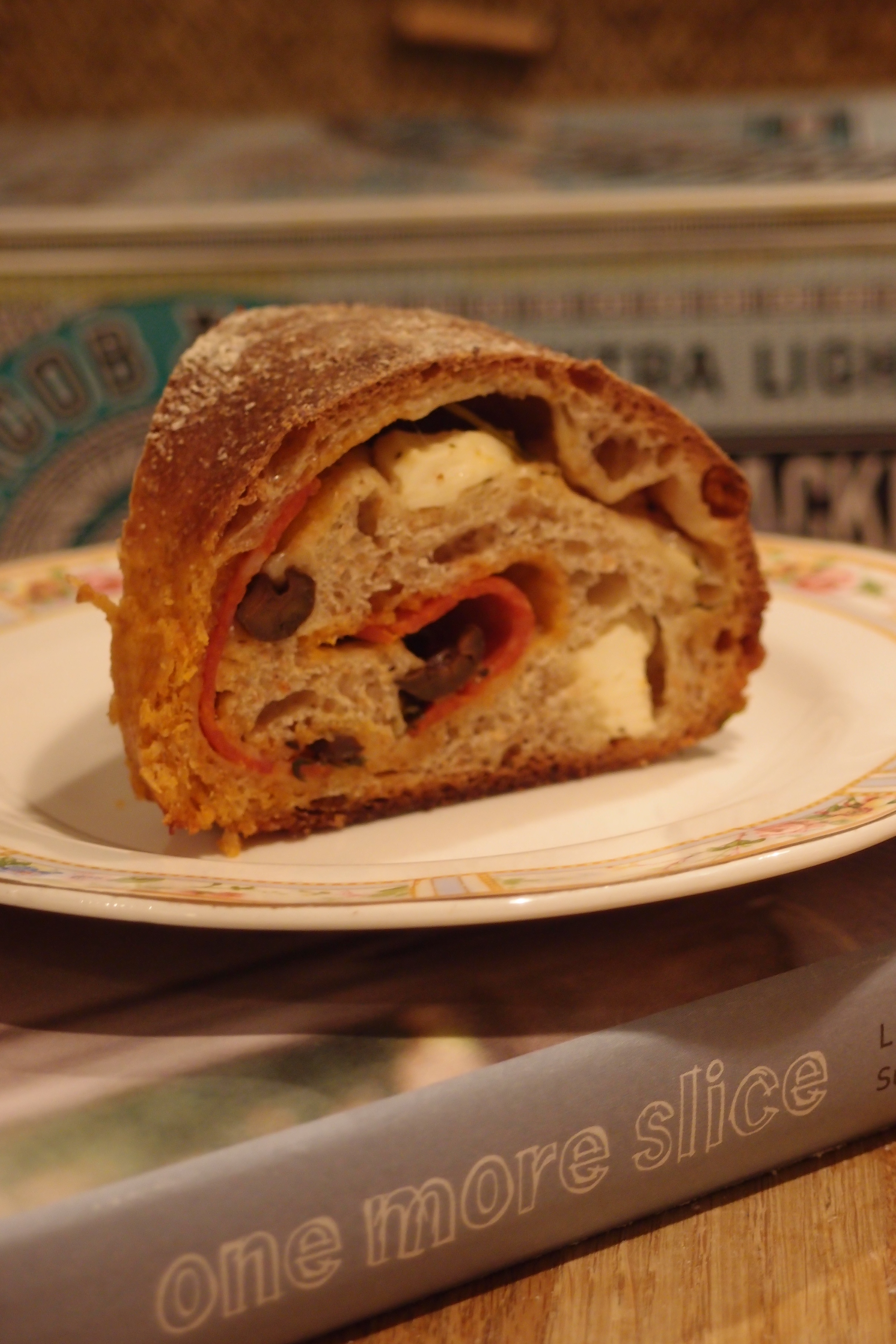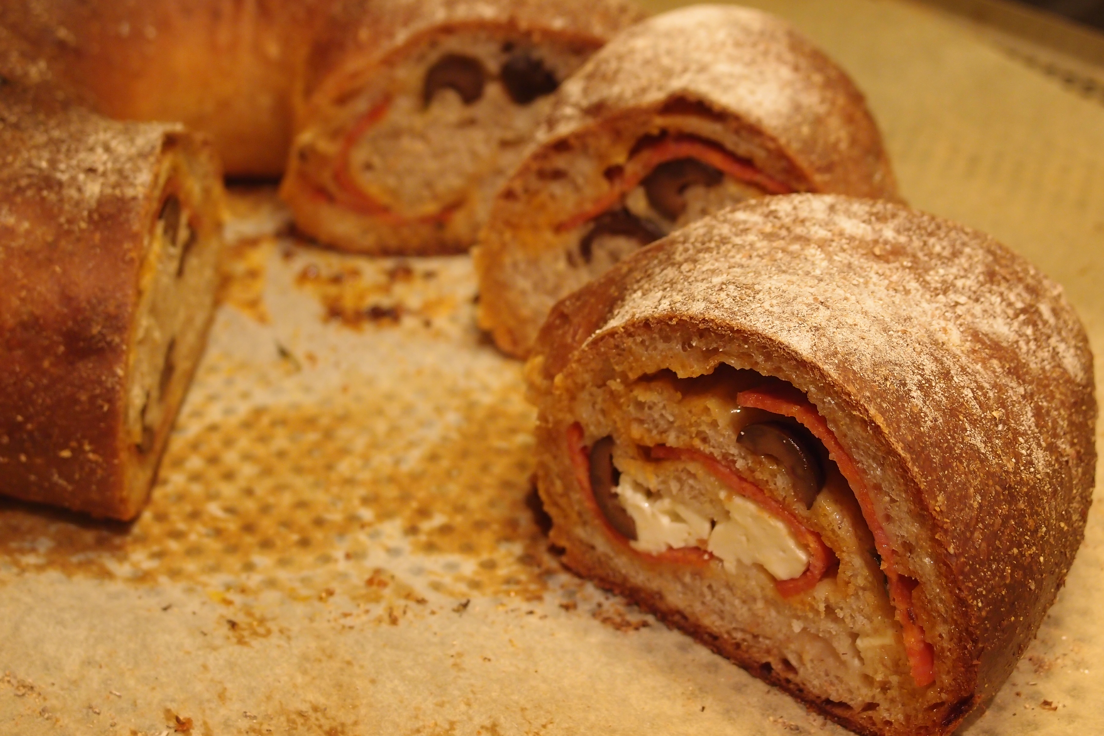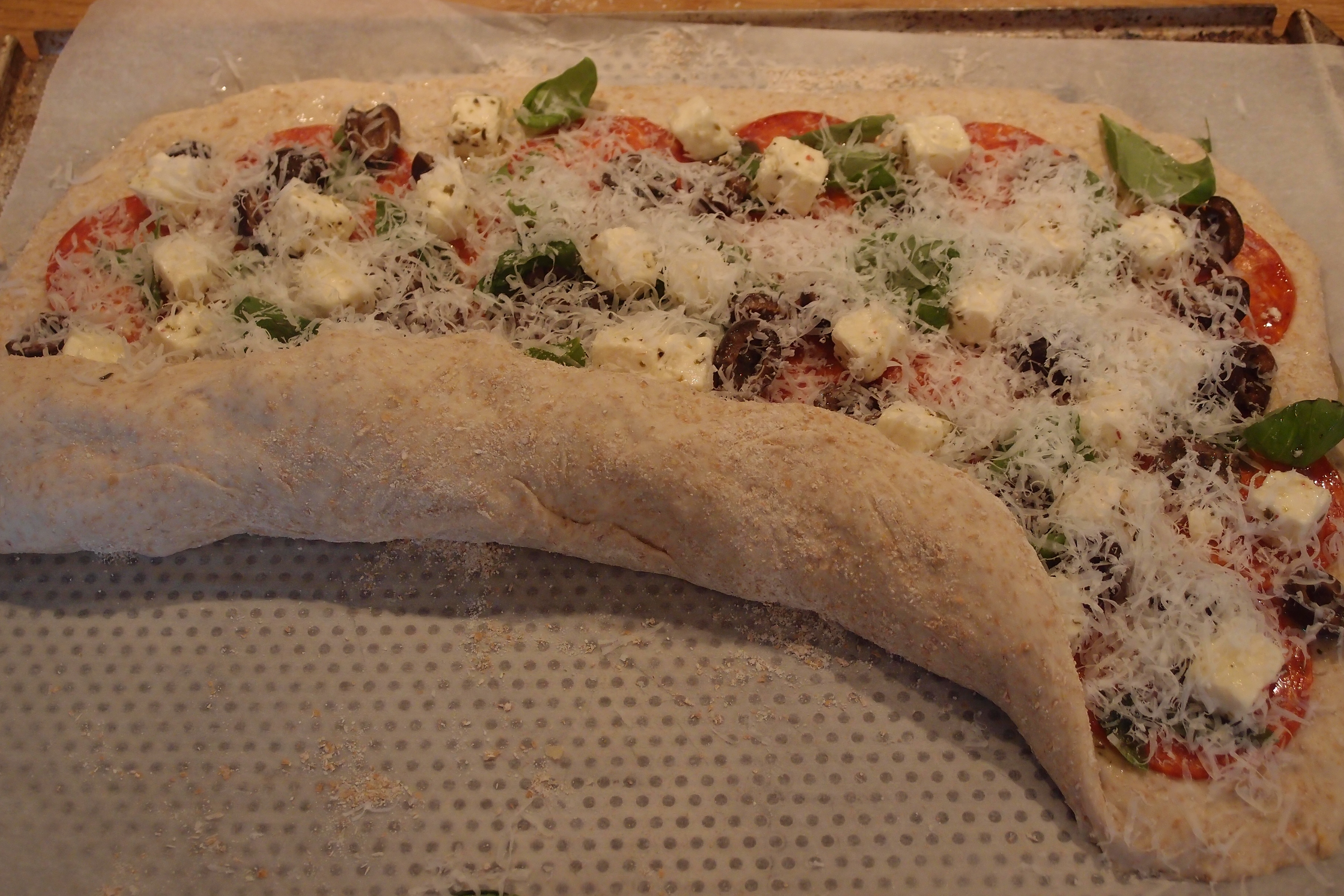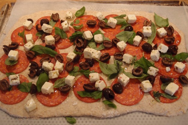 Jag har utgått från Leilas recept på Tortano men använt dinkelmjöl och fyllt det med salami, basilika, fetaost, oliver och parmesan. Yammey!