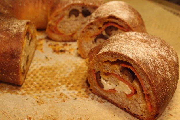 Det här brödet är supergott och verkligen enkelt att variera efter tycke och smak. Mjölet går bra att byta ut och till fyllningen kan man verkligen ta det man gillar. Här kommer några tips; mozzarella, prosciutto, getost, nötter, honung, pesto, rosmarin, tillagade grönsaker eller stekt svamp. Tänk ”pizza” så löser det sig!