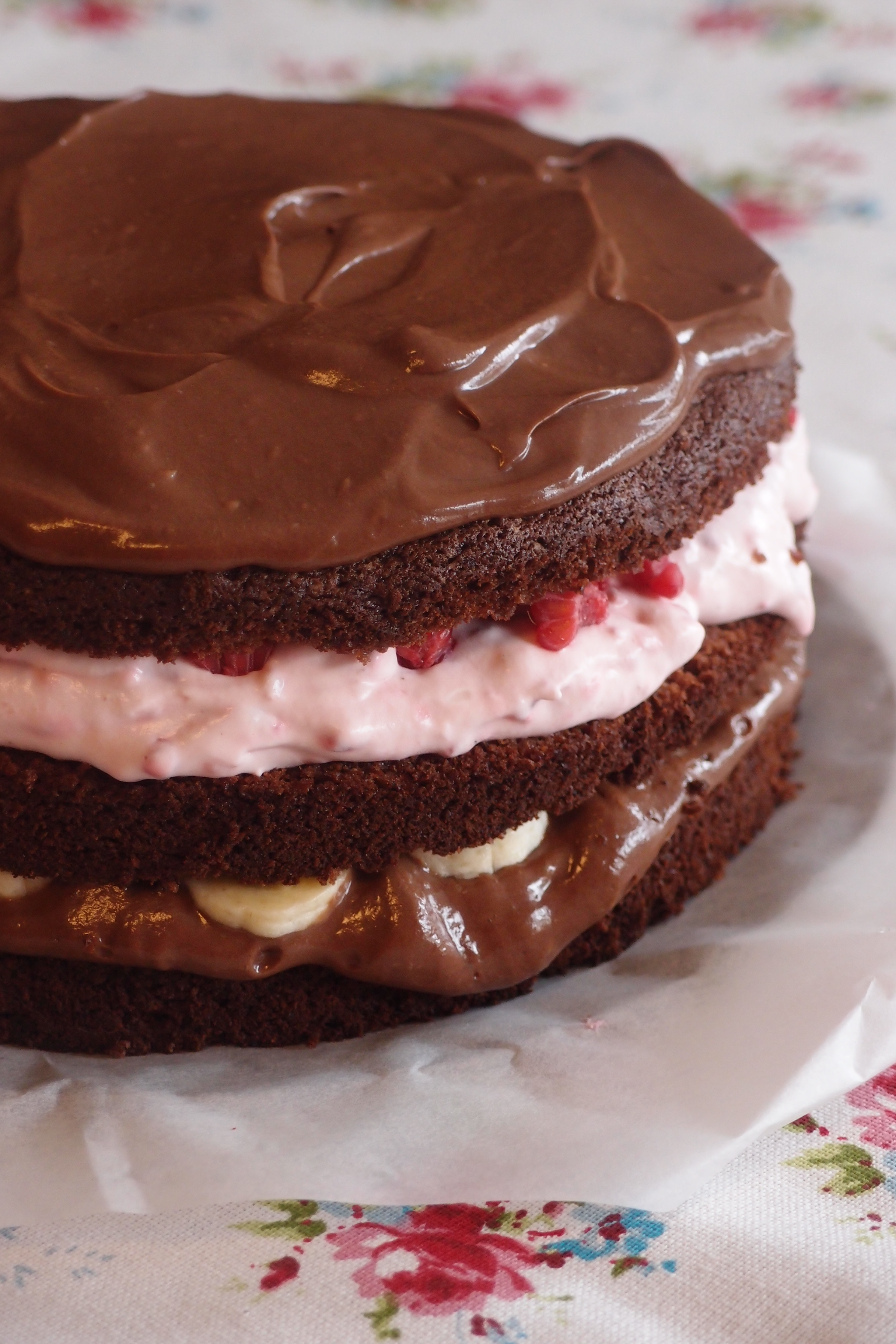 Bilden har inget med inlägget att göra men visst ser den här tårtan god ut? 🙂 Kanske kan den fungera som inspiration inför farsdag. Mellan chokladbottnar gottar sig hallongrädde och nutellamousse.  Hallon och bananskivor samsas också om utrymme.  ♡