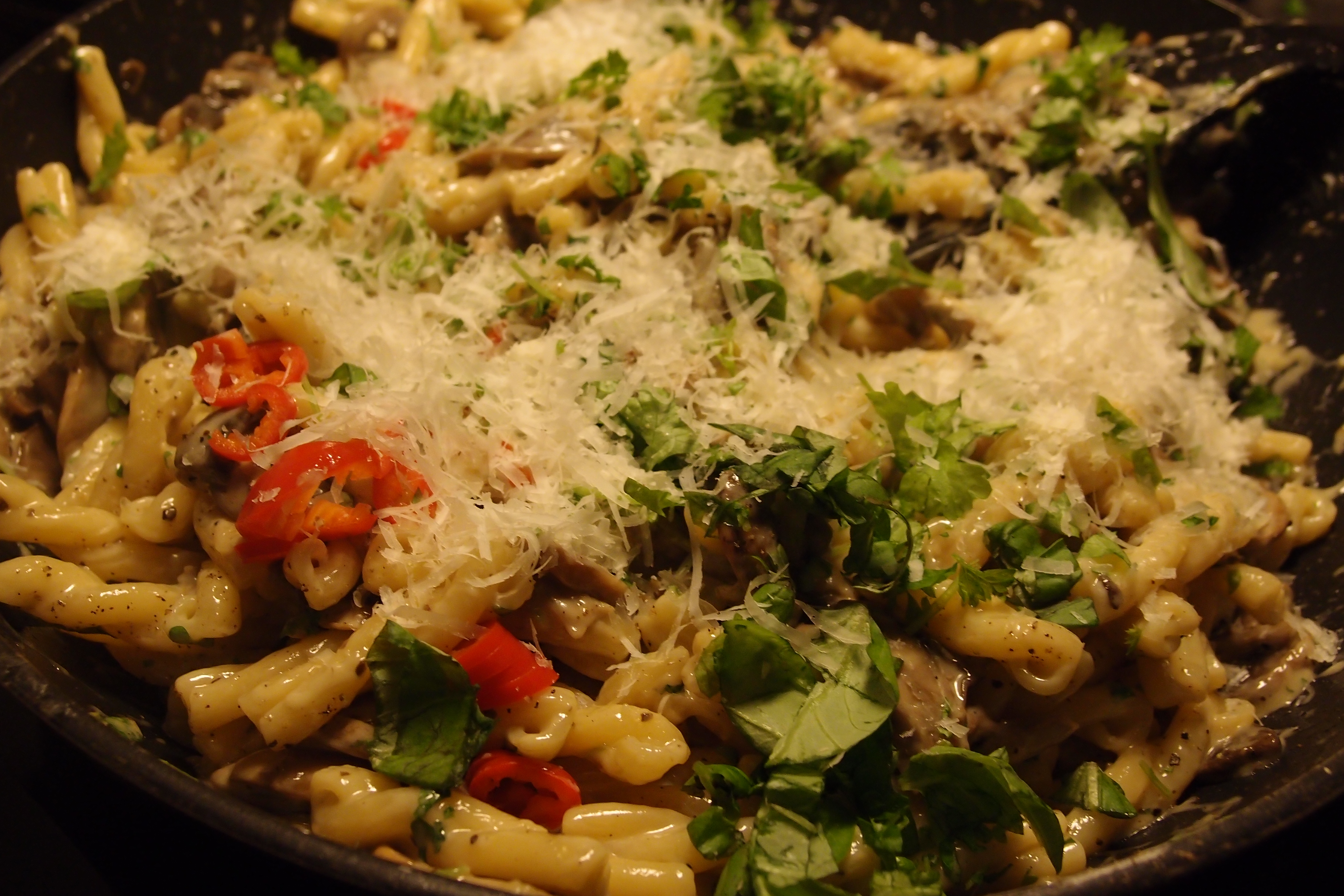 Putsa svampen och skiva den tunt. Stek svampen i torr panna tills vätskan försvinner. Lägg i en klick smör, häll på lite olivolja och tillsätt även skivad vitlök och låt fräsa en stund. Häll på grädde och smulad buljongtärning och låt koka ihop. Smaka av med salt, peppar och tryffelolja. Koka pasta al dente enligt förpackningens anvisningar. Låt pasta rinna av. Blanda såsen med riven ost, finhackade kryddor och pasta. Toppa ev med chili. Servera med parmesan och färska kryddor.